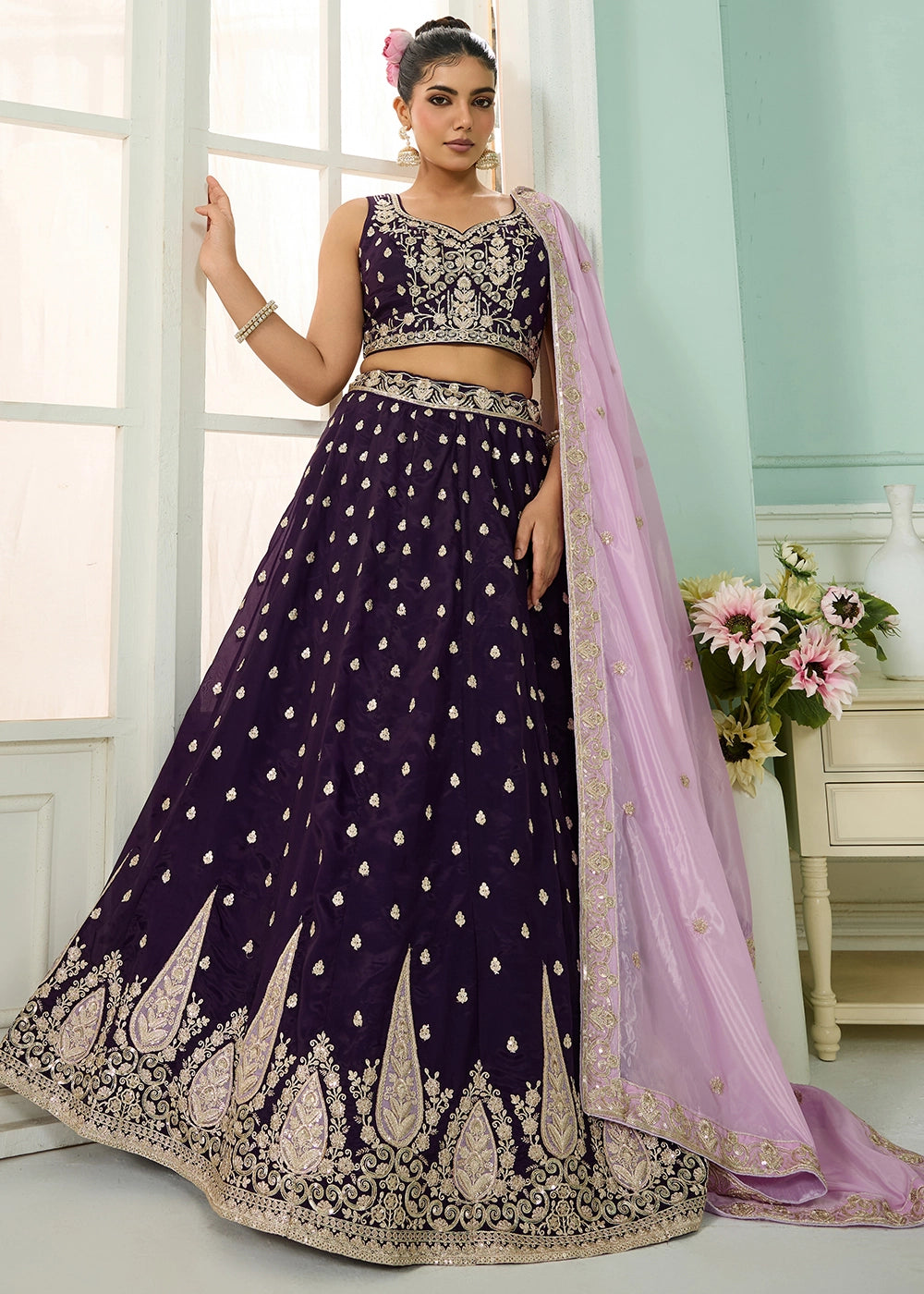 Plum Purple Organza Lehenga Choli with Handcrafted Floral & Sequin Work