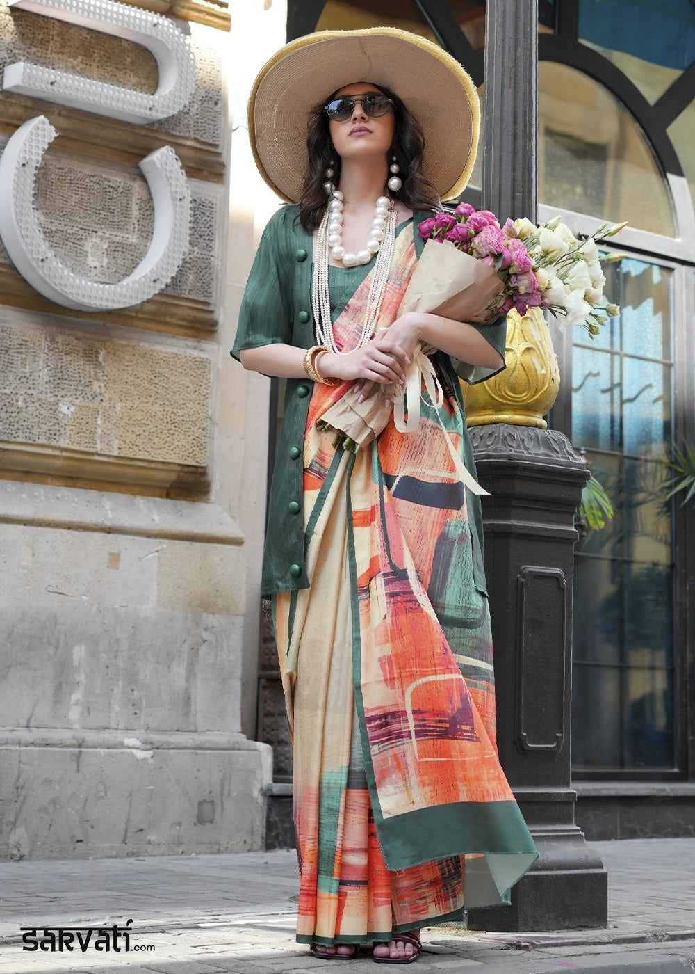 Shades Of Orange Silk Saree with Contemporary Abstract Print