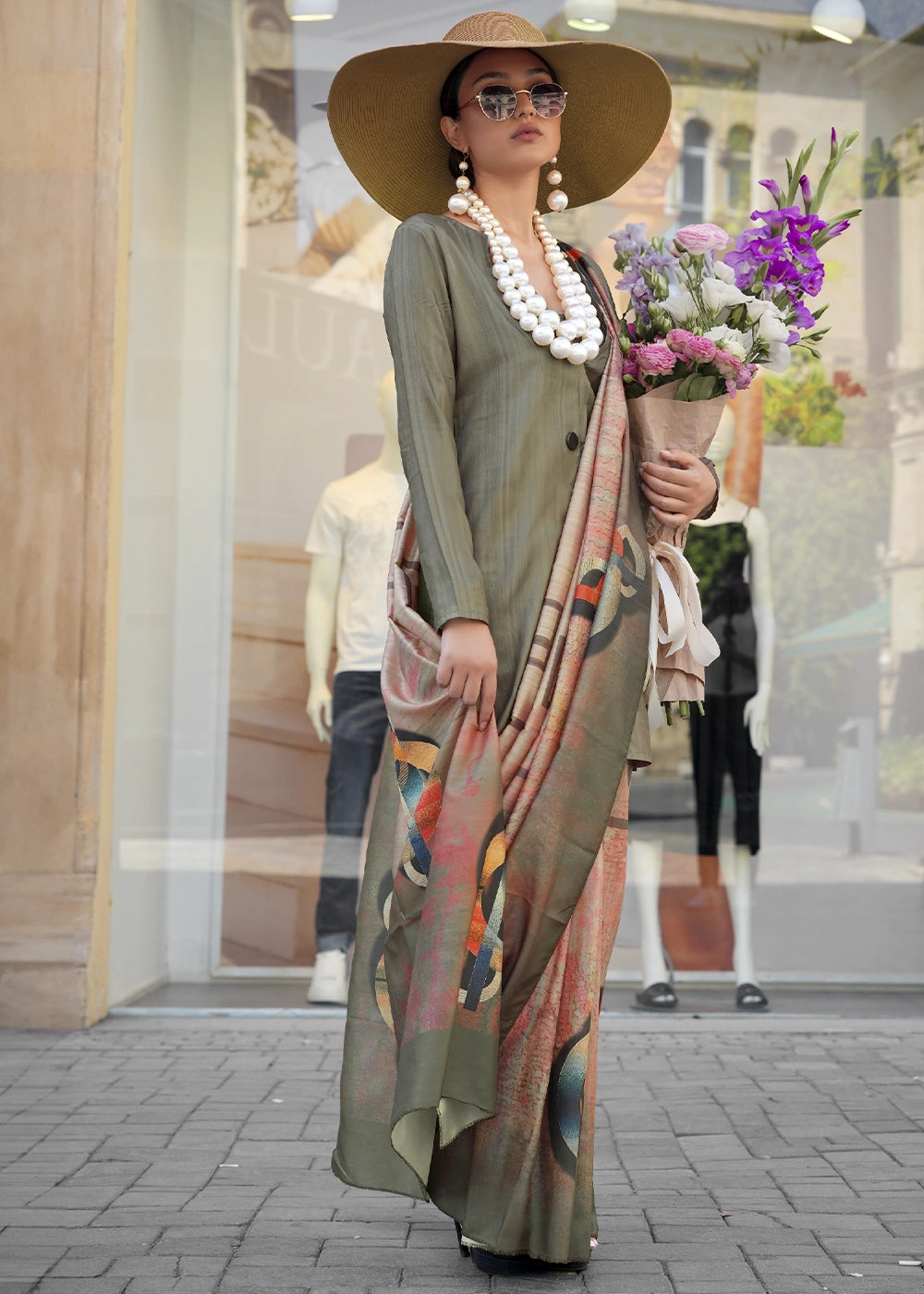 Greenish Grey Silk Saree with Contemporary Abstract Print