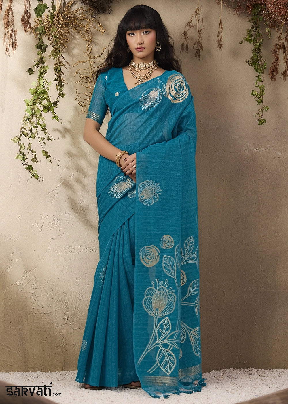Cyan Blue Embroidered Satin Crepe Saree with Aari Detailing