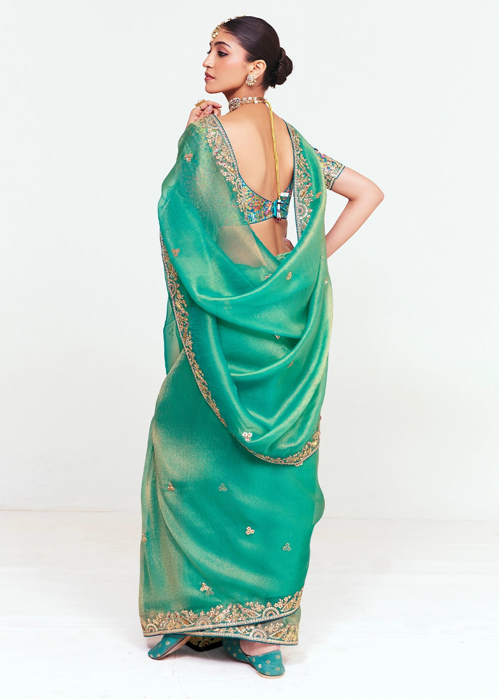 Mint Green Embellished Tissue Saree with Sequins and Thread Work