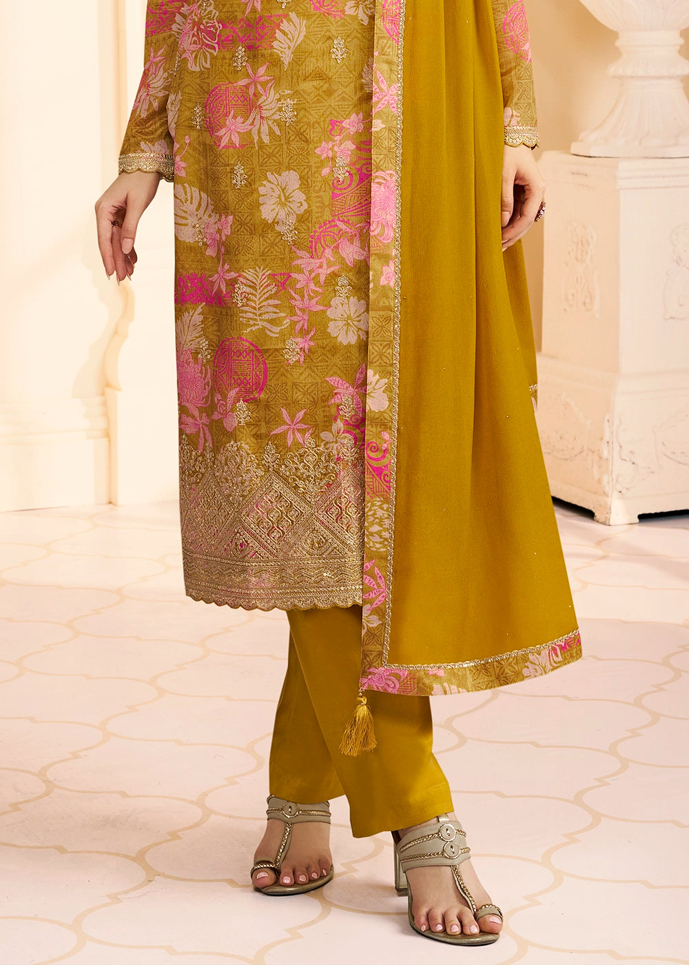 Mustard Yellow Chinon Silk Floral Printed Pant Suit with Embroidered Detailing