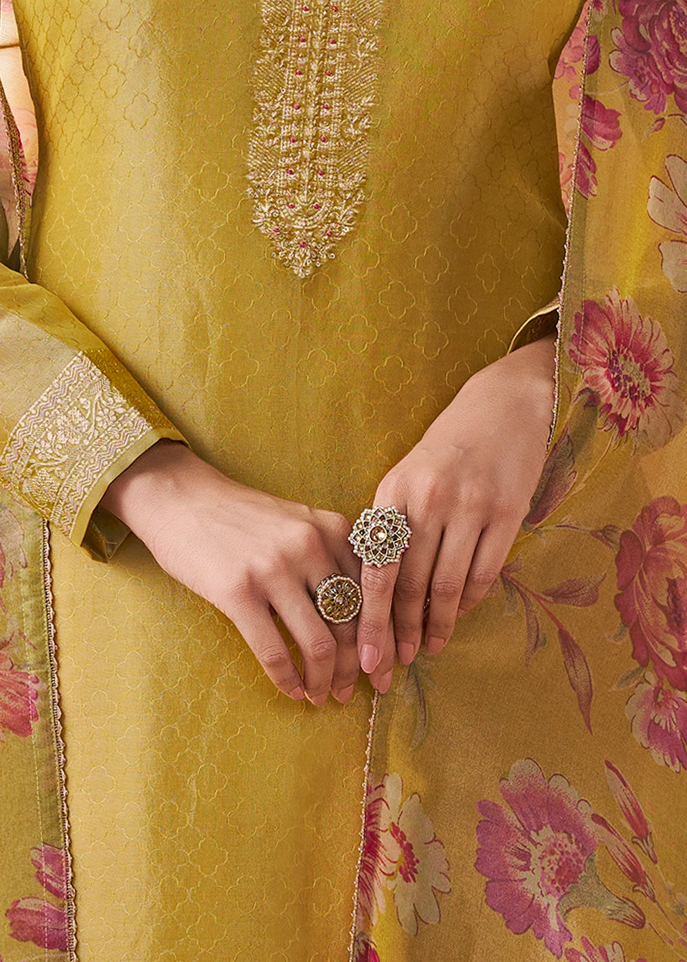 Mustard Yellow Silk Pant Suit Set with Fine Embroidery