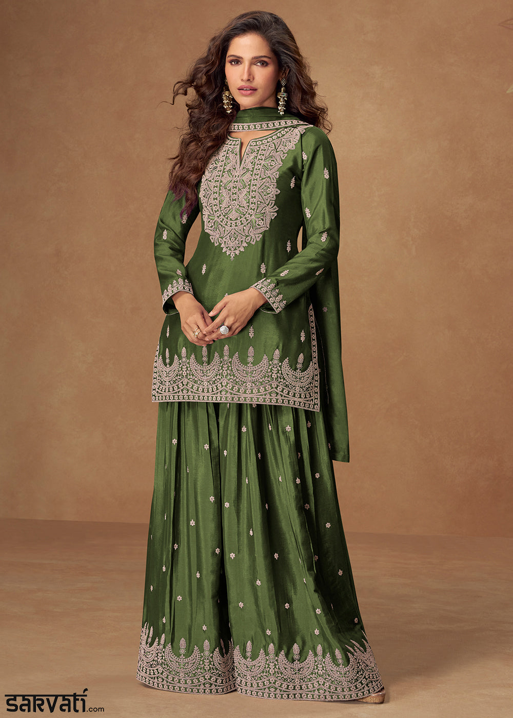 Pickle Green Chinon Silk Palazo suit with Intricate embroidery work