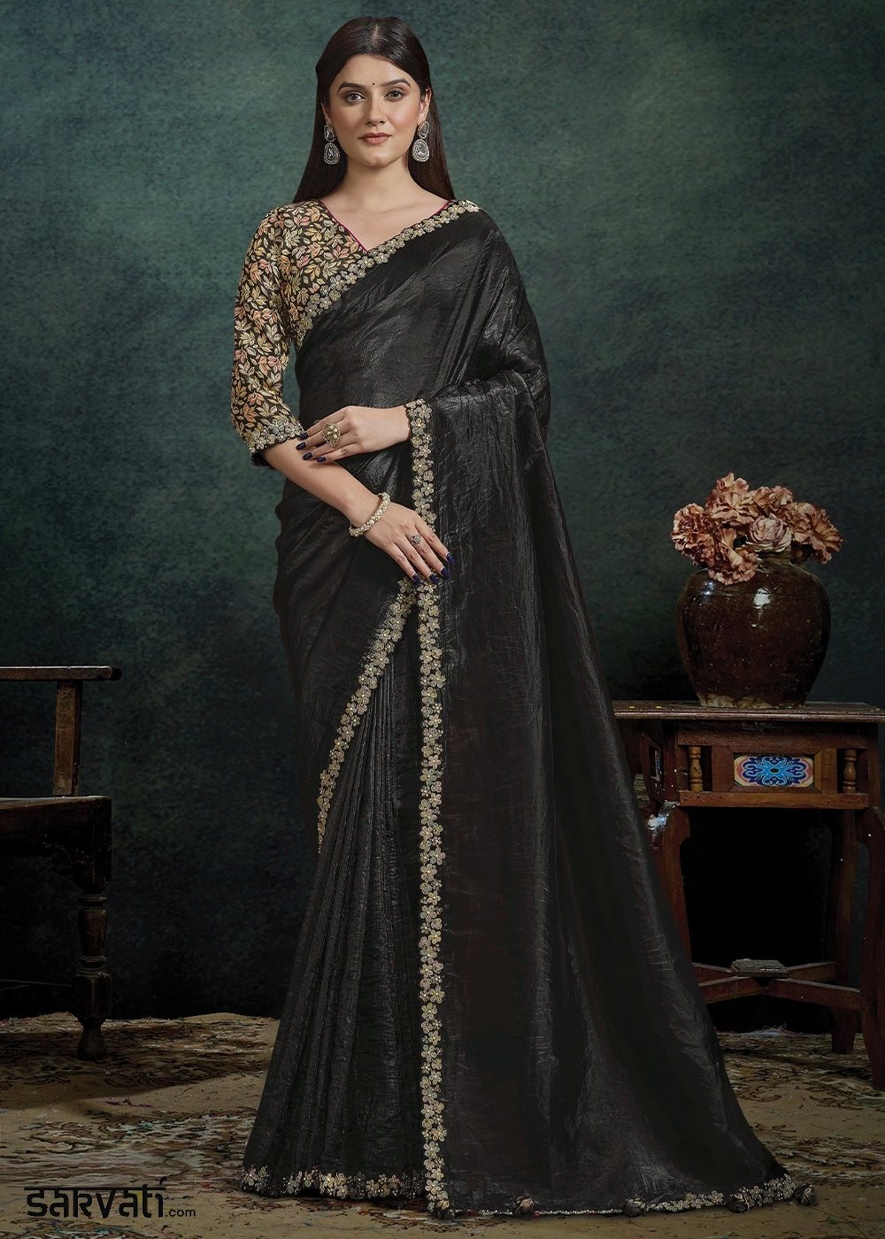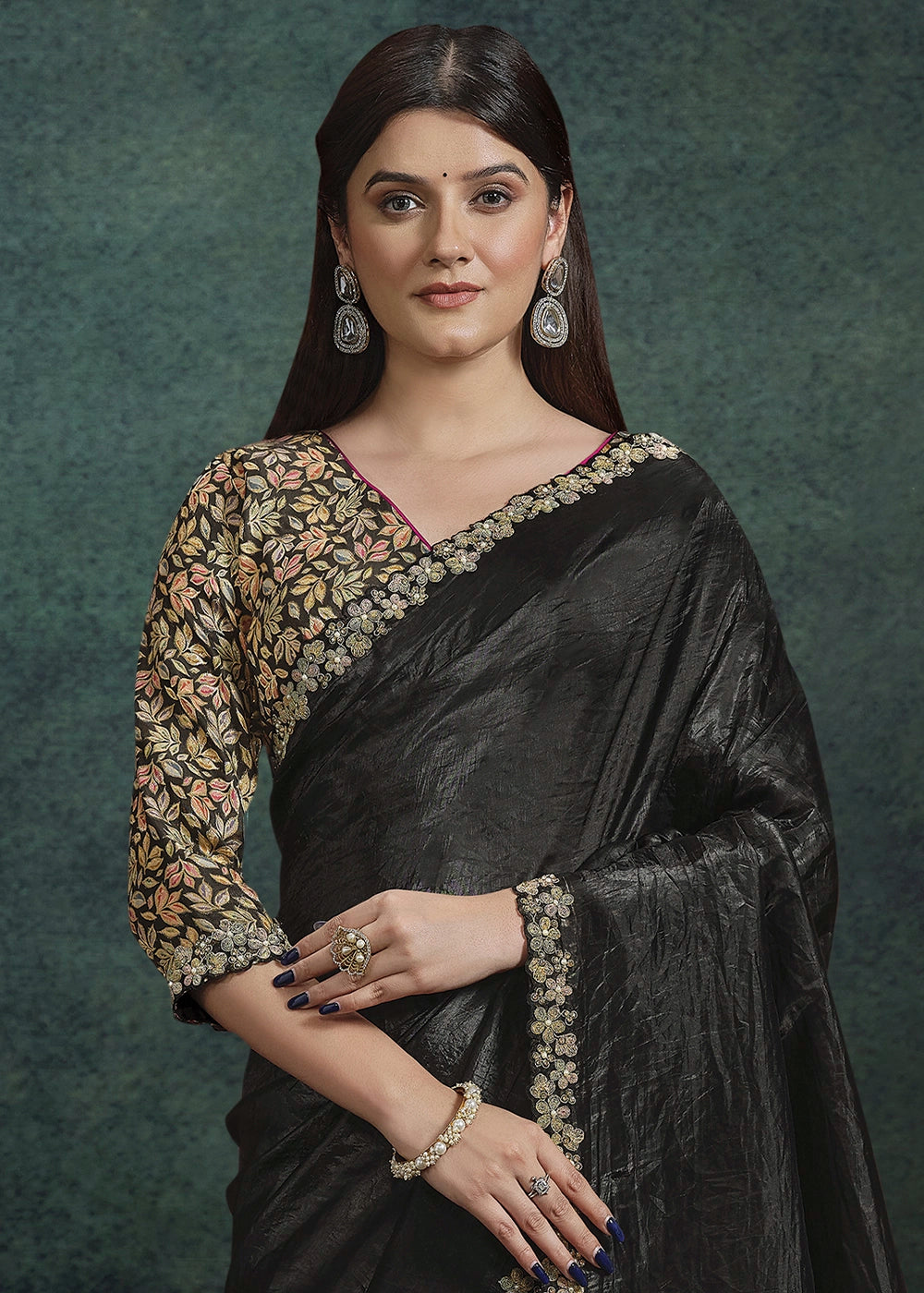 Charcoal Black Crushed Paper Silk Saree with Floral Embroidery