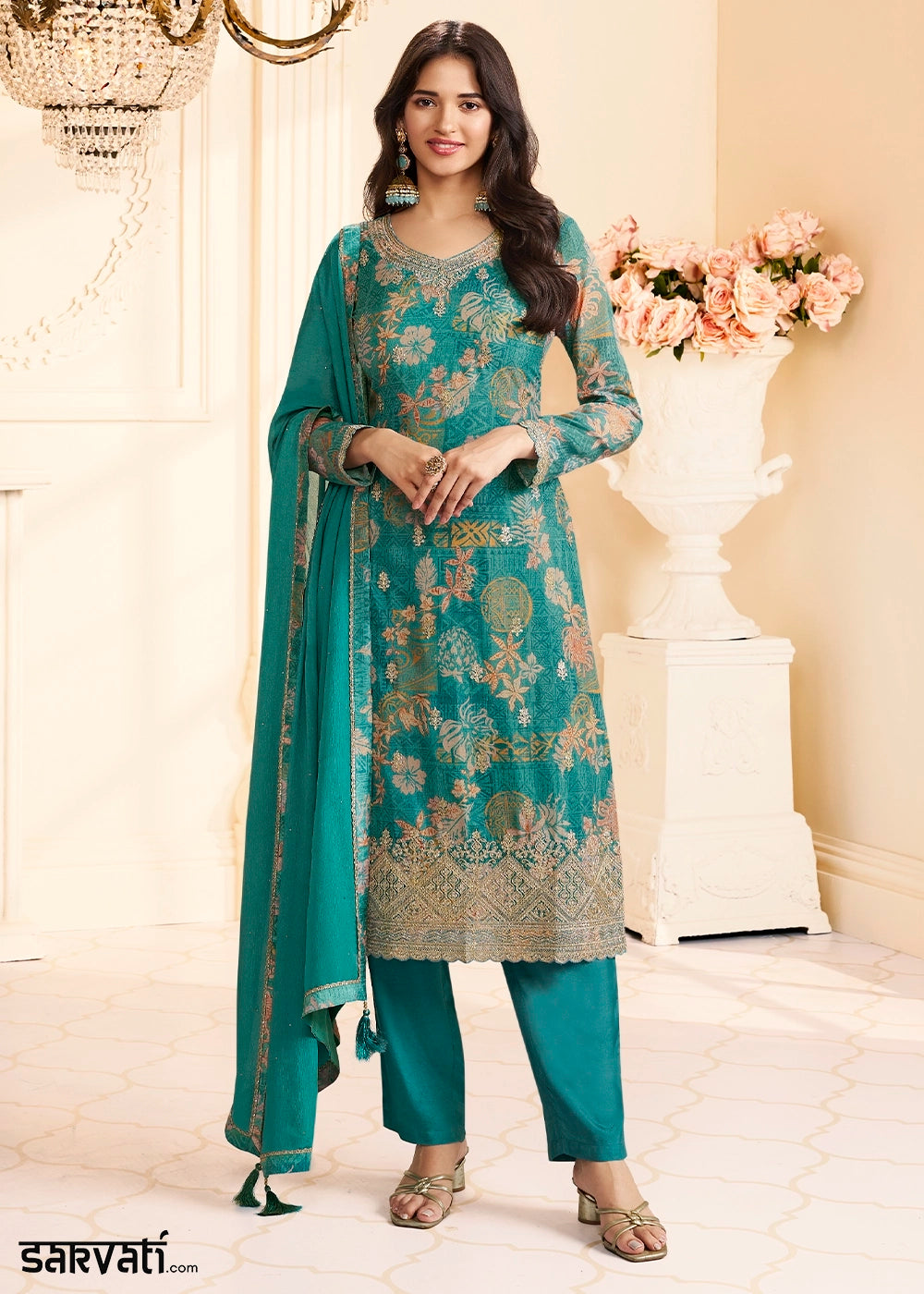 Sacramento Green Chinon Silk Palazzo suit with Intricate embroidery work