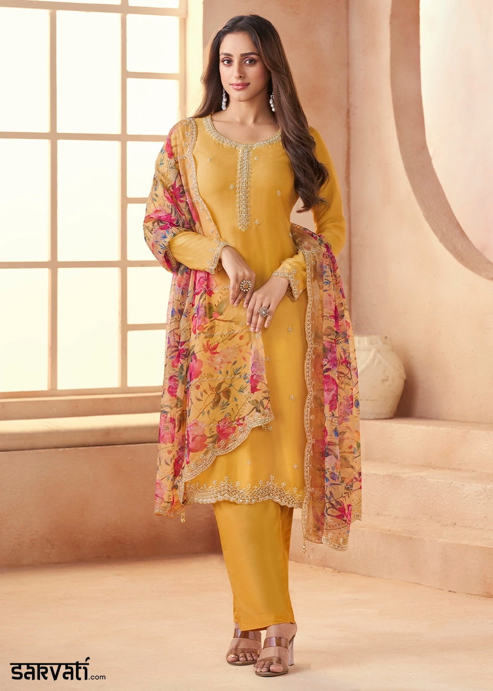 Mustard Yellow Chinon Silk Floral Printed Pant Suit with Embroidered Detailing