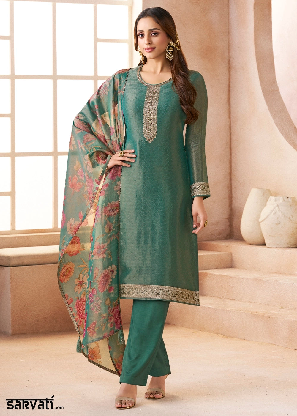 Cadmium Green Organza Chiffon Pant Suit Set with Floral Printed Dupatta