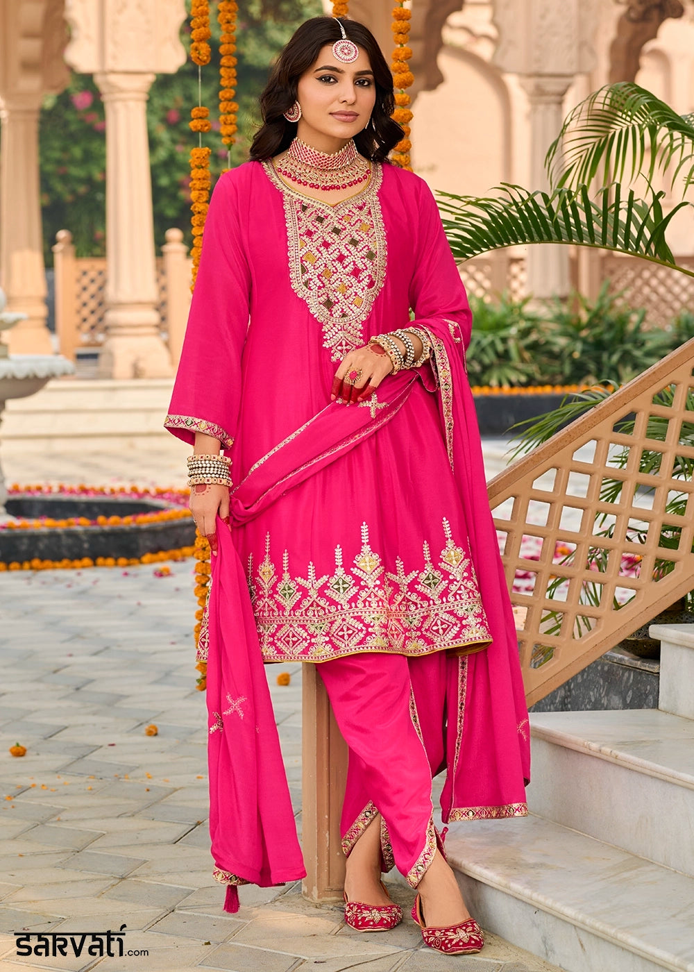 Hot Pink Chinon Silk Palazzo Suit with Heavy Embroidered Work