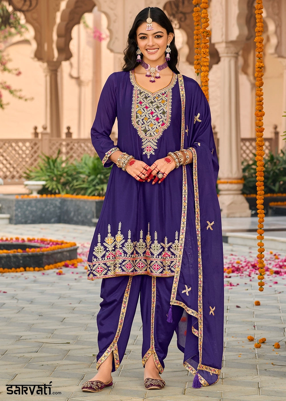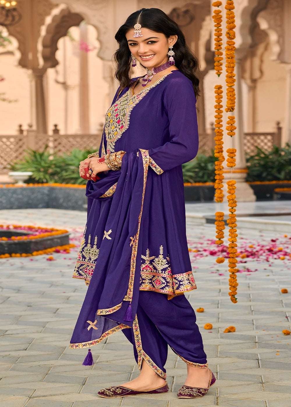 Indigo Purple Chinon Silk Suit with Embroidery and Dhoti Style Bottom