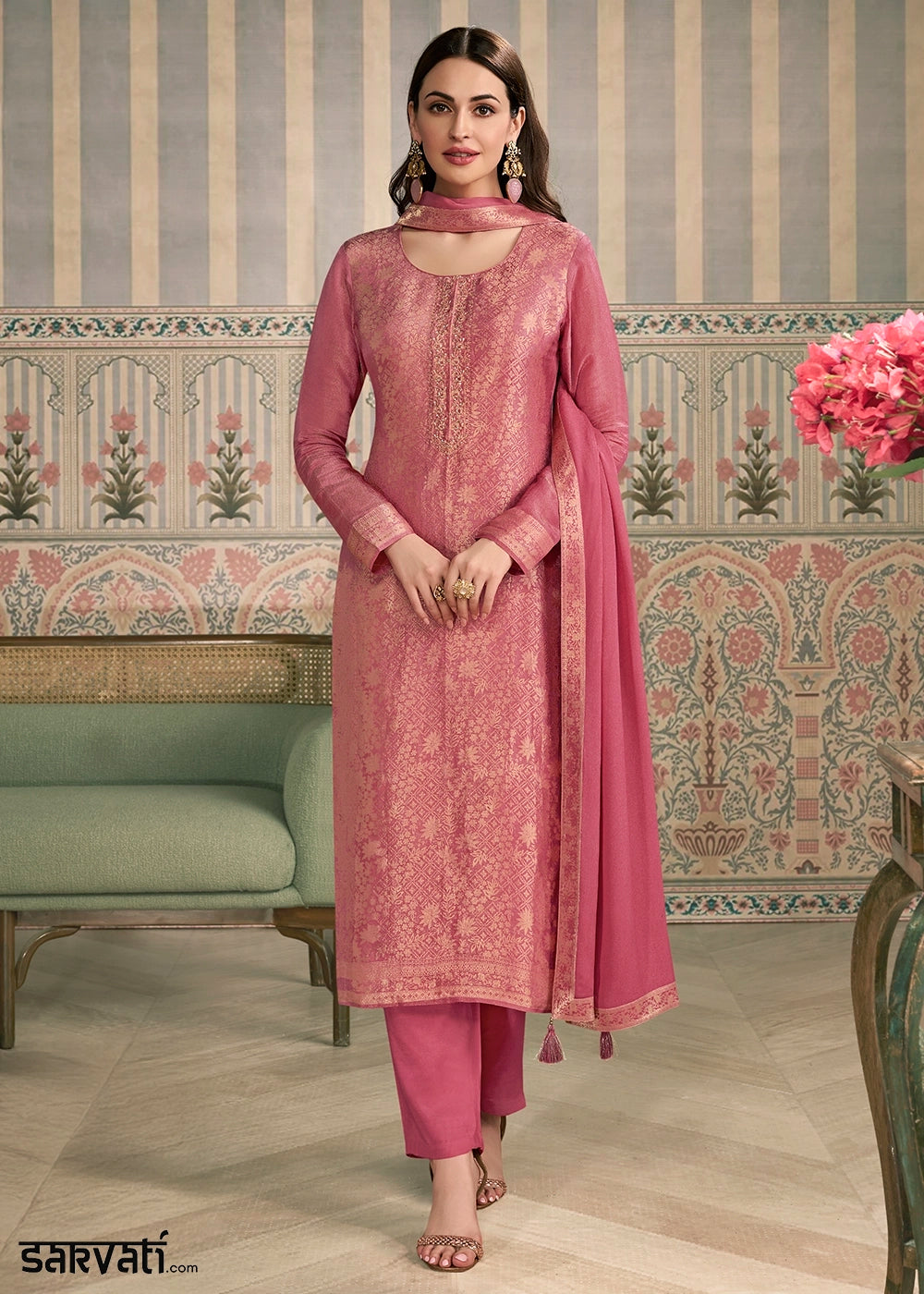 Watermelon Pink Jacquard Simar Silk Pant Suit with Hand Embroidery