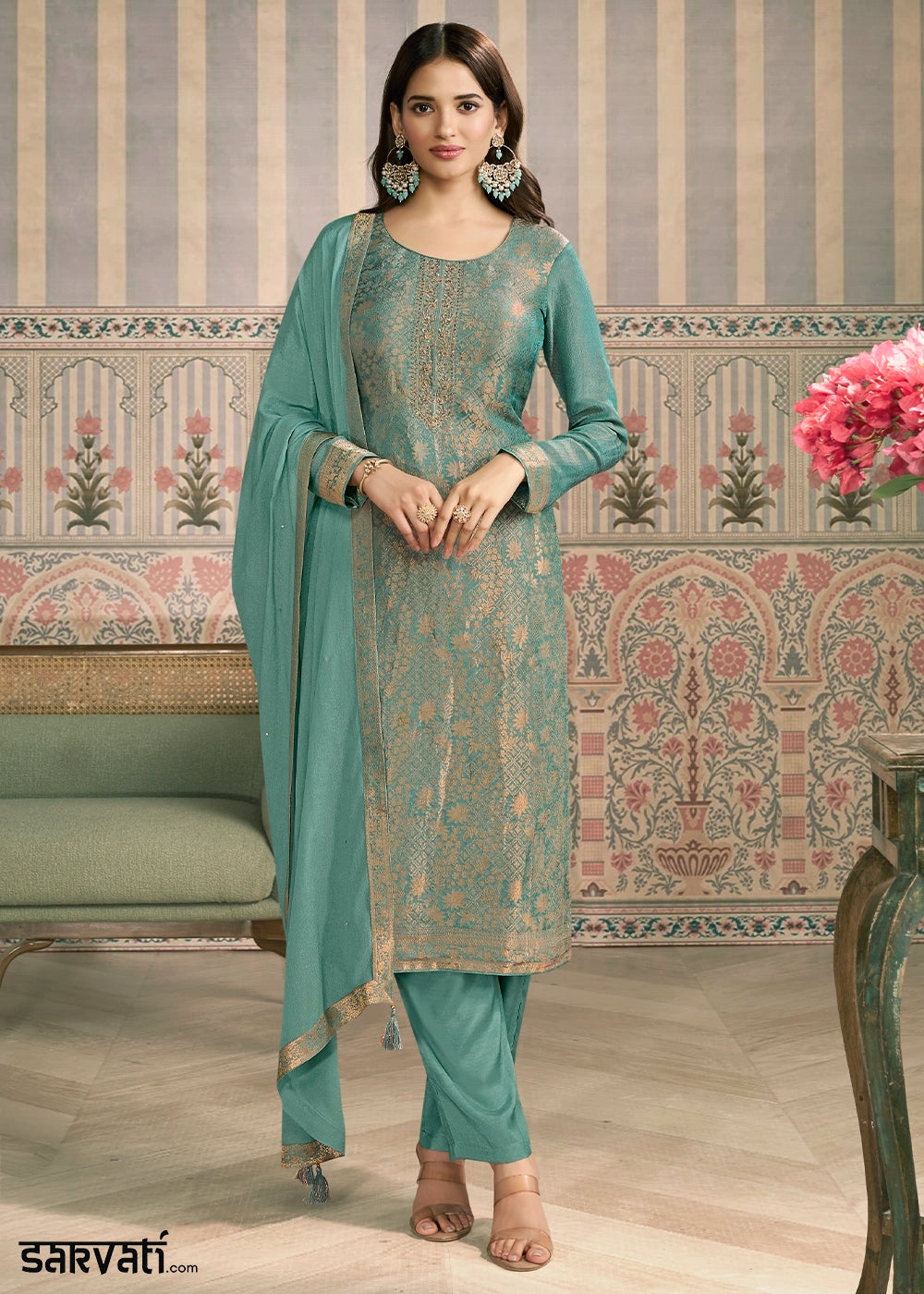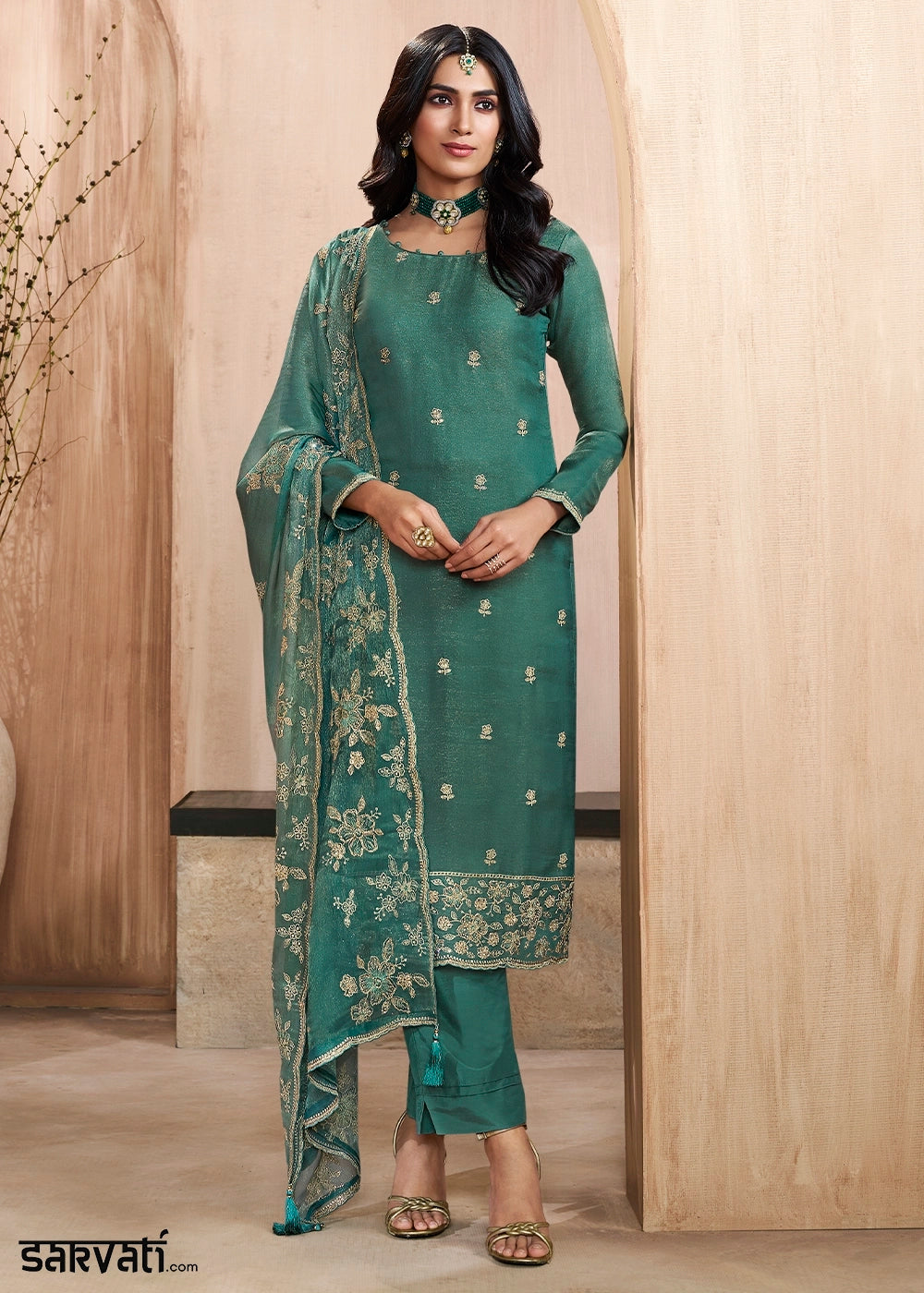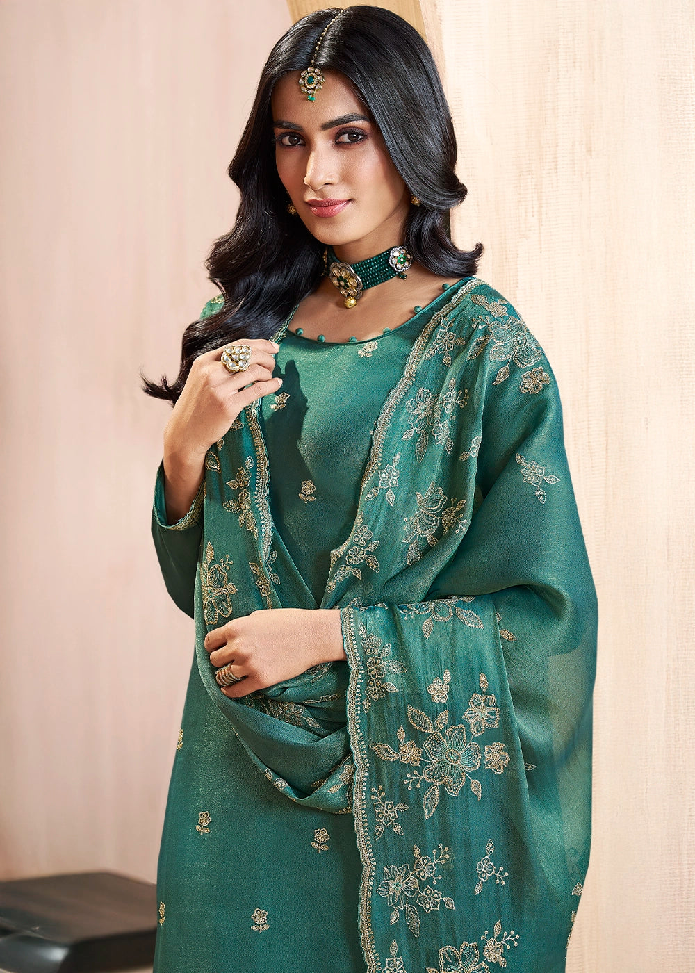 Teal Green Chinon Silk Luxury Palazzo Suit with Ornate Embroidery
