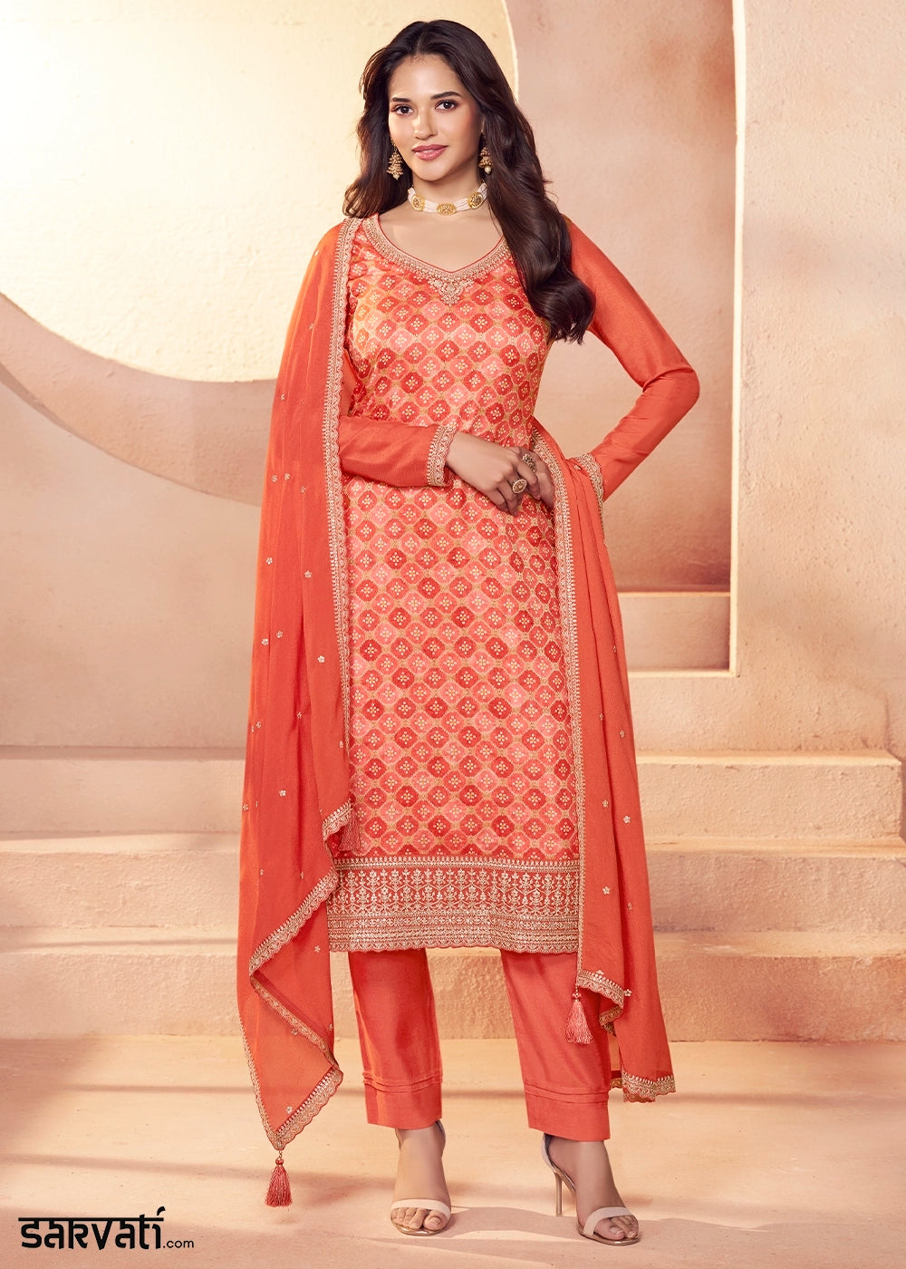 Coral Orange Embroidered Silk Pant Suit Set