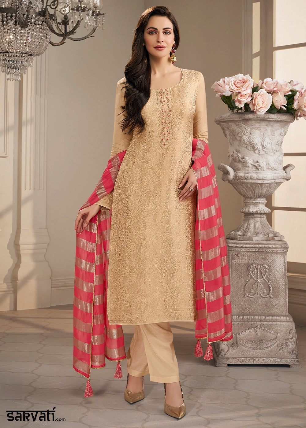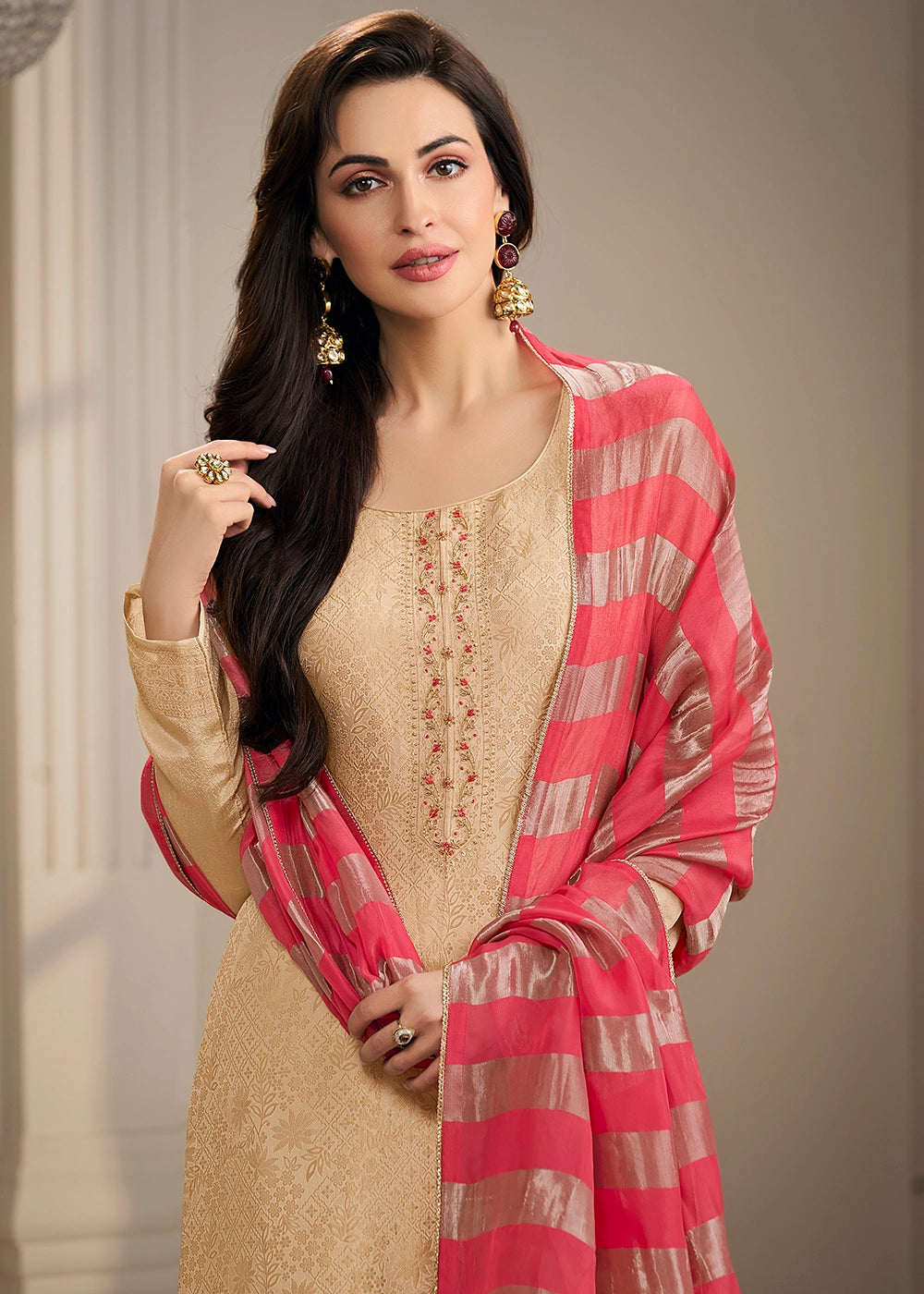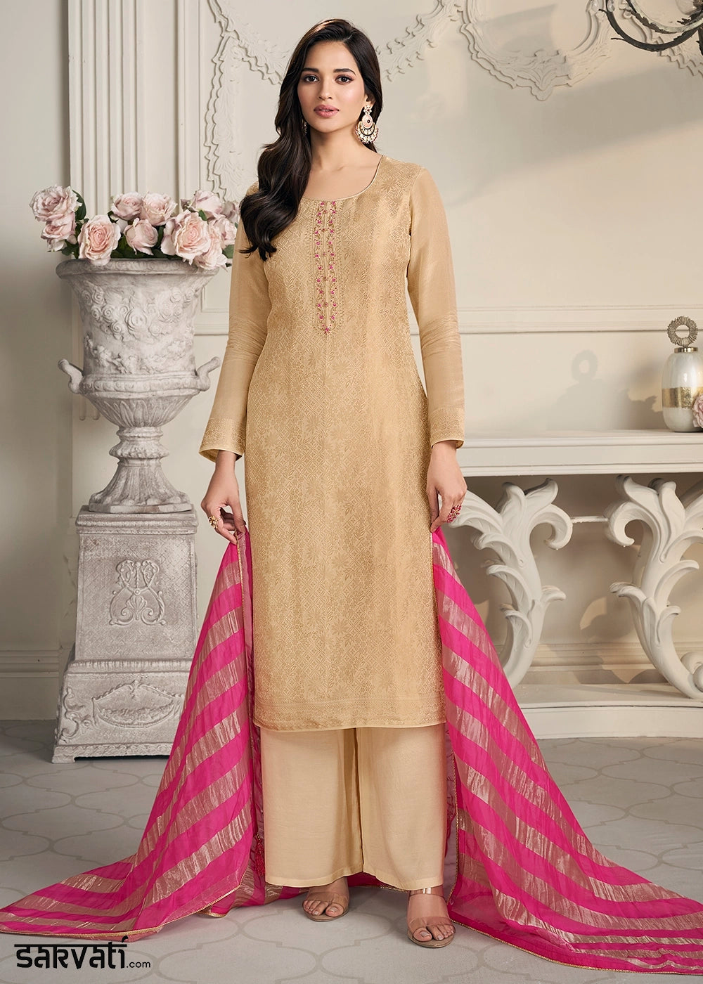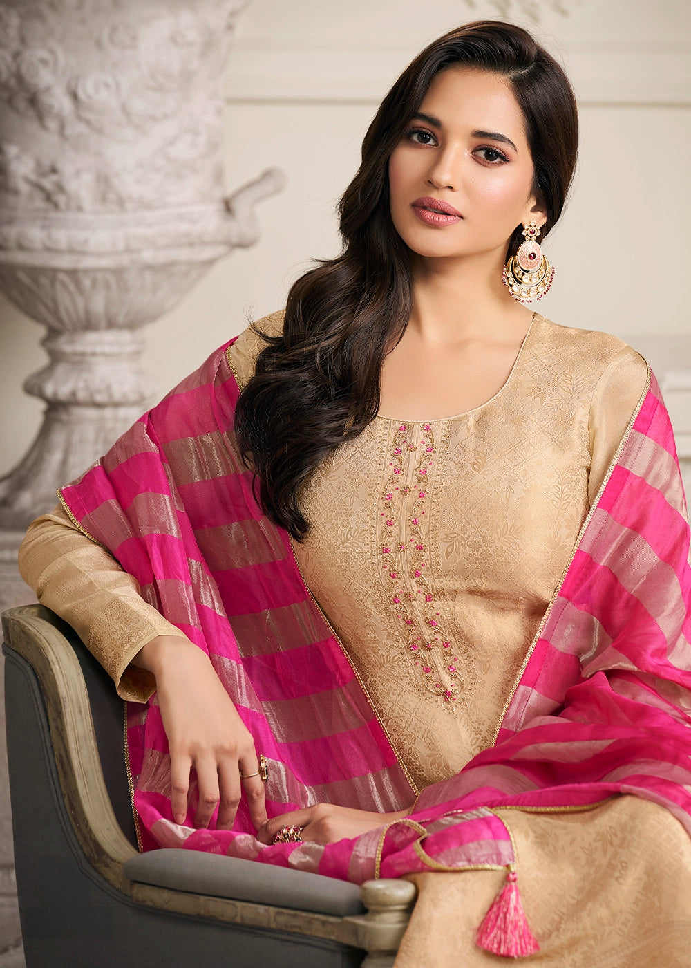 Beige Brown Jacquard Simar Silk Pant Suit with Pink Organza Dupatta