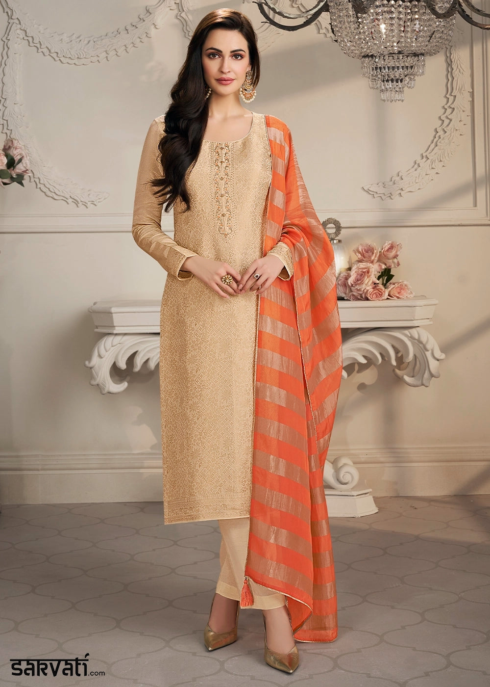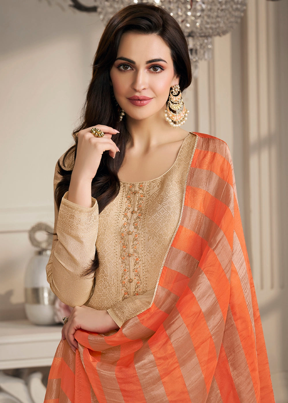 Beige Brown Jacquard Simar Silk Pant Suit with Orange Organza Dupatta