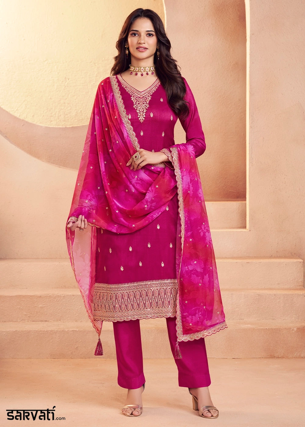 Magenta Pink Chinon Silk Luxury Palazzo Suit with Ornate Embroidery