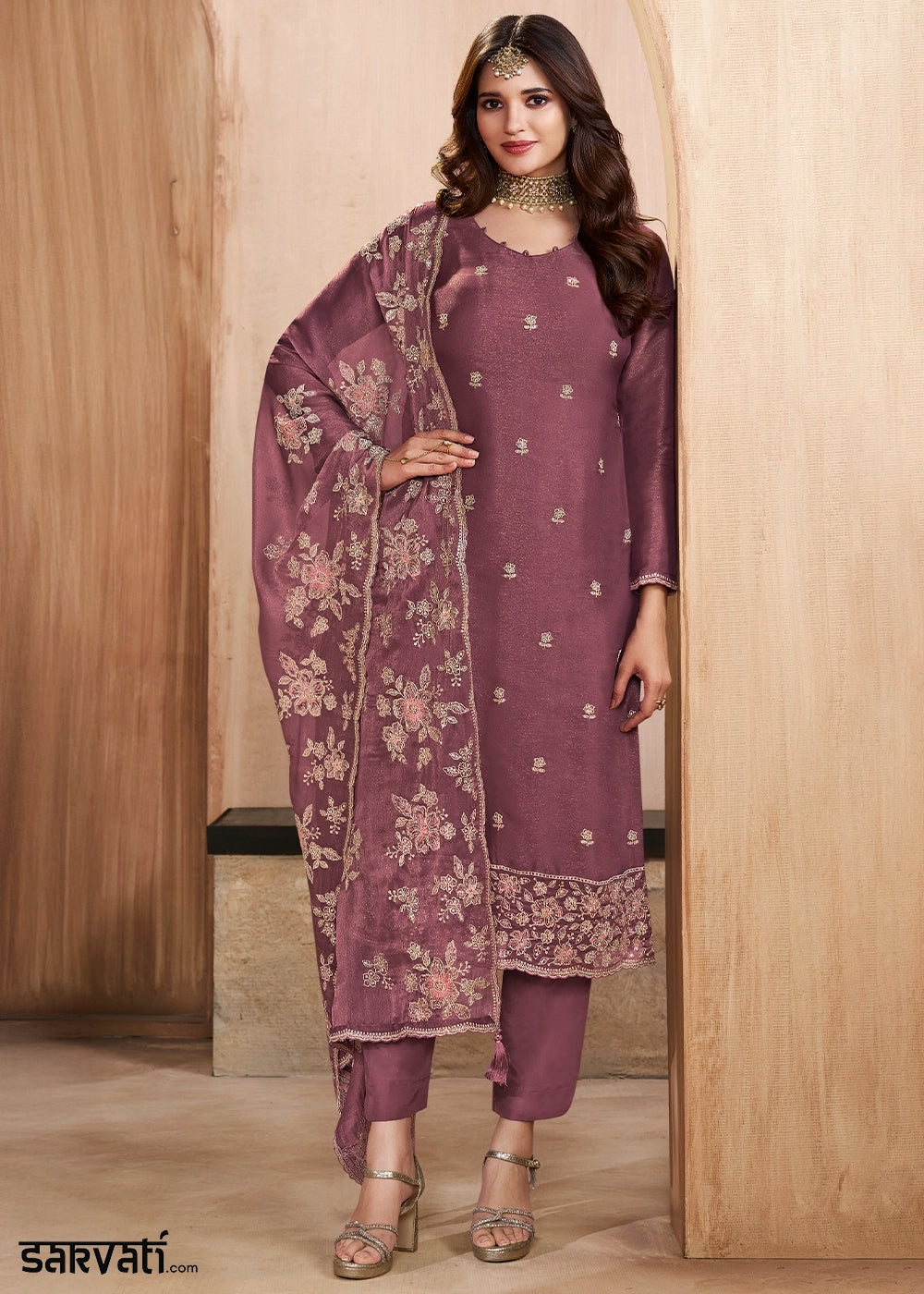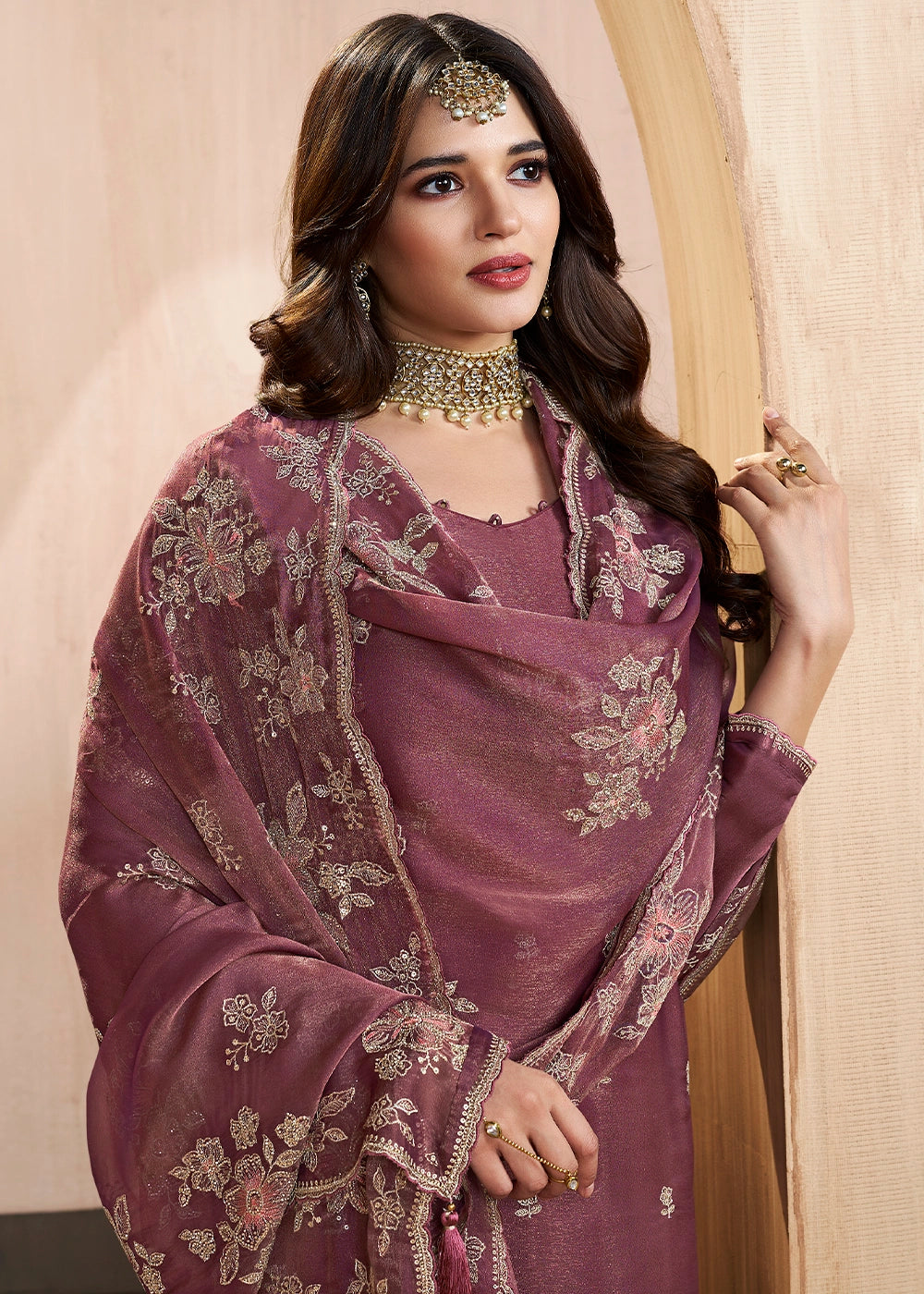Deep Lilac Purple Chinon Silk Palazzo Suit with Heavy Embroidered Work