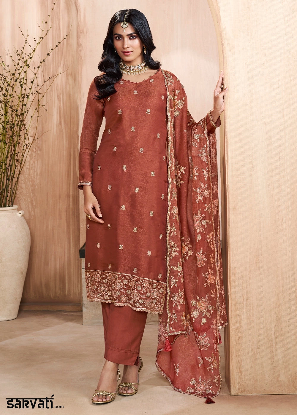 Chestnut Brown Silk Pant Suit Set with Intricate Floral Embroidery