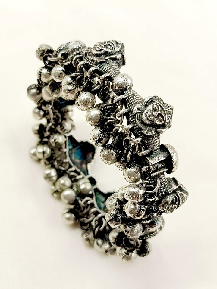 This Openable Oxidized Kada Showcases Exquisite Fencing Detailing And Temple Motifs, All Crafted From Oxidized Silver Plated Brass Metal. Elevate Your Look With This Timeless Piece, Perfect For Any Occasion. Expertly Designed For A Sophisticated And Classic Aesthetic.