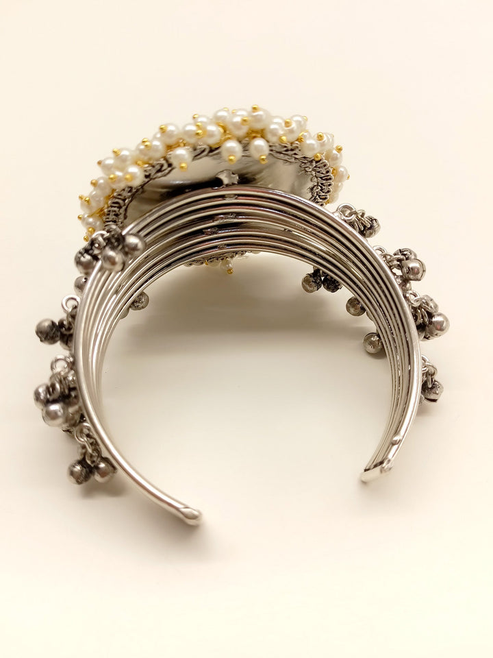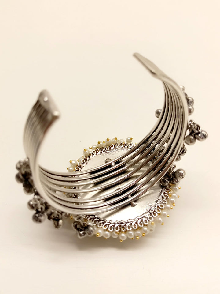 This Traditional Adjustable Oxidized Kada Is The Perfect Addition To Any Outfit. Crafted From Silver Plated Brass Metal And Silver Ball And Pearl Detailing, It Perfectly Captures A Classic Look. It's The Perfect Way To Add A Touch Of Ethnicity To An Outfit.