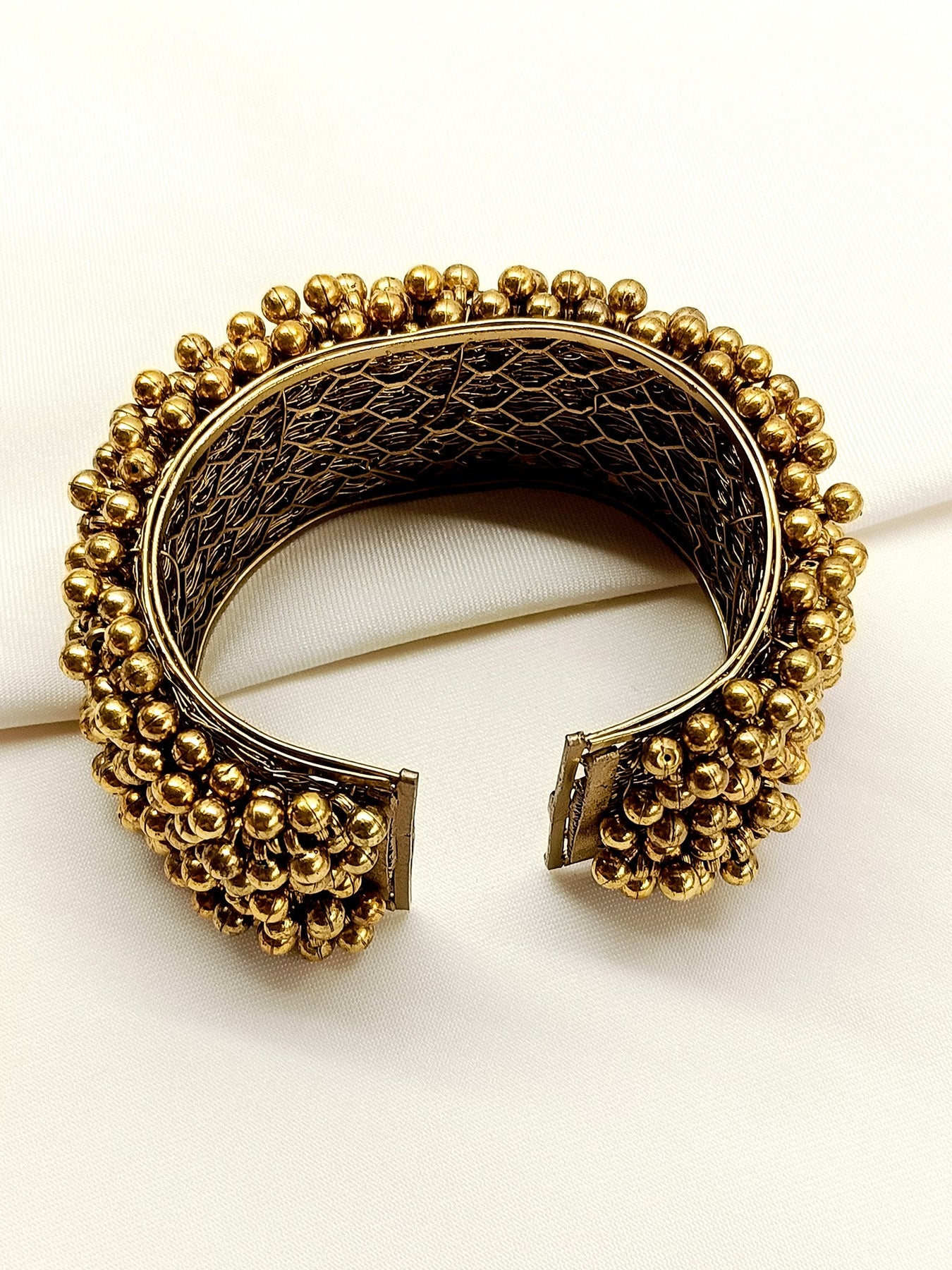 This Golden Oxidized Bracelet Features An Antique Gold Plating That Enhances Its Vintage Appeal. Crafted With Metal Balls, It Offers A Sturdy Yet Elegant Design, Perfect For Adding A Timeless Touch To Your Accessory Collection. Its Oxidized Finish Ensures Durability While Maintaining A Classic Look Suitable For Various Occasions.