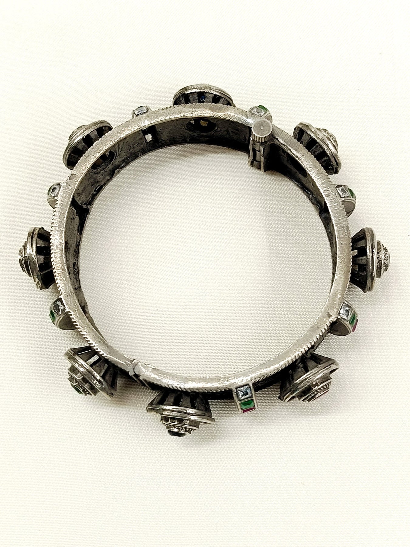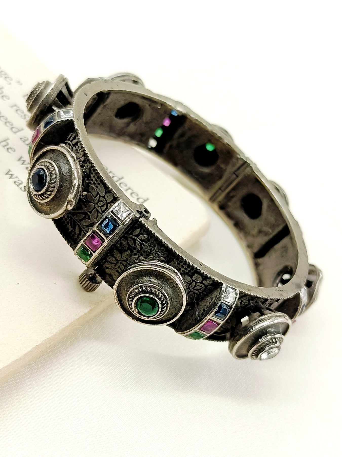 This Multi Colour Oxidized Kada Features A Distinctive Oxidized Black Polish That Enhances Its Vintage Appeal. Adorned With Carefully Set Stones, It Offers A Vibrant Contrast That Elevates Any Traditional Or Contemporary Outfit. Crafted For Durability And Style, This Kada Is An Expert Choice For Those Seeking A Bold Yet Elegant Accessory.