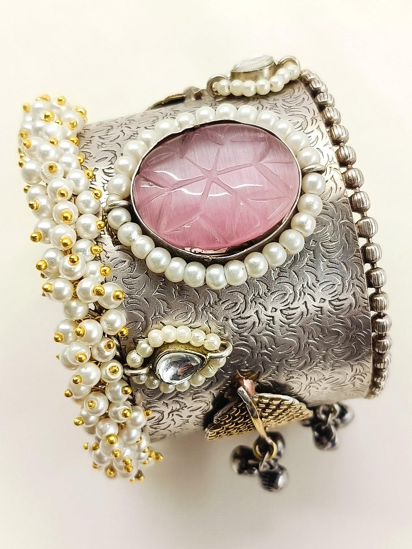 This Pink Oxidized Bracelet Expertly Combines Oxidized Silver With Gold Plating, Creating A Striking Contrast That Enhances Its Vintage Appeal. Adorned With Lustrous Pearls, Delicate Ghunghroo Accents, And Semi-precious Stones, It Offers A Unique Blend Of Traditional Craftsmanship And Contemporary Style. Perfect For Adding An Elegant, Artisanal Touch To Any Outfit.