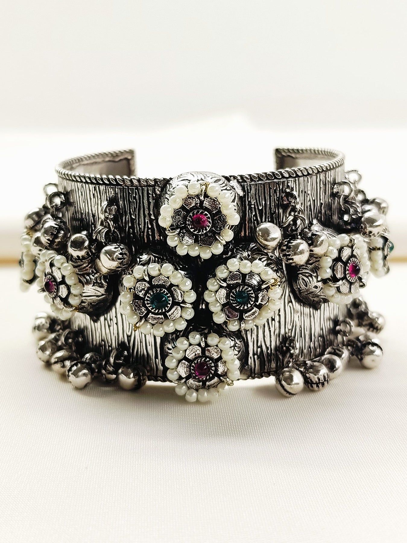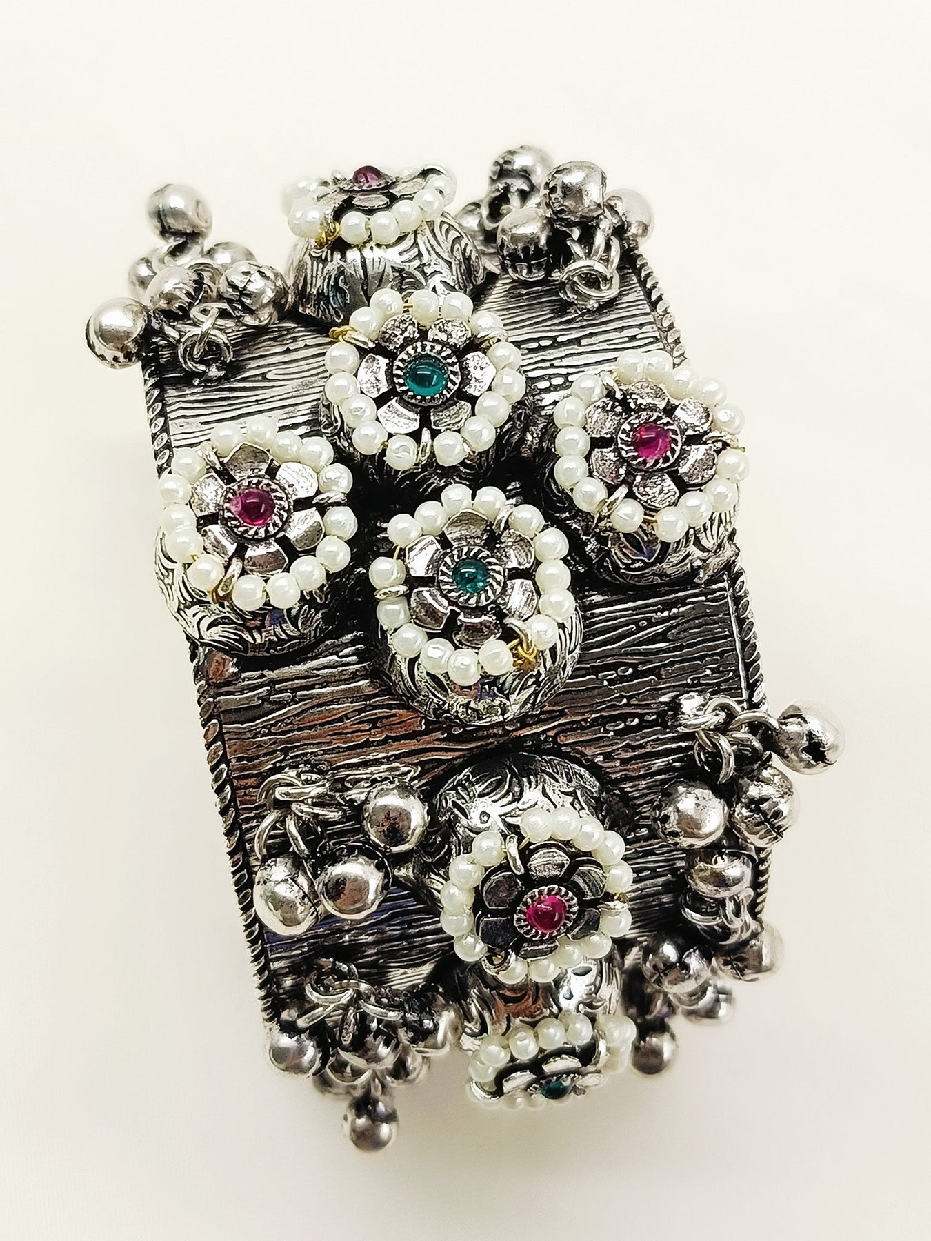 The R&G Oxidized Bracelet Showcases Expert Craftsmanship With Its Oxidized Silver-plated Brass Base, Offering A Rich, Antique Finish. Detailed With Traditional Ghunghroo Accents And Carefully Selected Semi-precious Stones, This Piece Combines Cultural Heritage With Elegant Design. Its Sturdy Construction And Refined Aesthetics Make It An Ideal Choice For Those Seeking A Distinctive Accessory That Enhances Both Classic And Modern Ensembles.