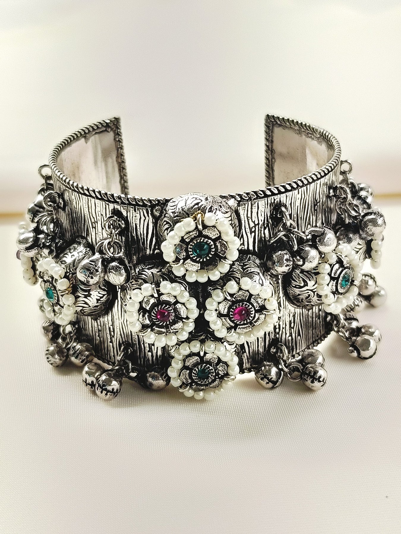 The R&G Oxidized Bracelet Showcases Expert Craftsmanship With Its Oxidized Silver-plated Brass Base, Offering A Rich, Antique Finish. Detailed With Traditional Ghunghroo Accents And Carefully Selected Semi-precious Stones, This Piece Combines Cultural Heritage With Elegant Design. Its Sturdy Construction And Refined Aesthetics Make It An Ideal Choice For Those Seeking A Distinctive Accessory That Enhances Both Classic And Modern Ensembles.
