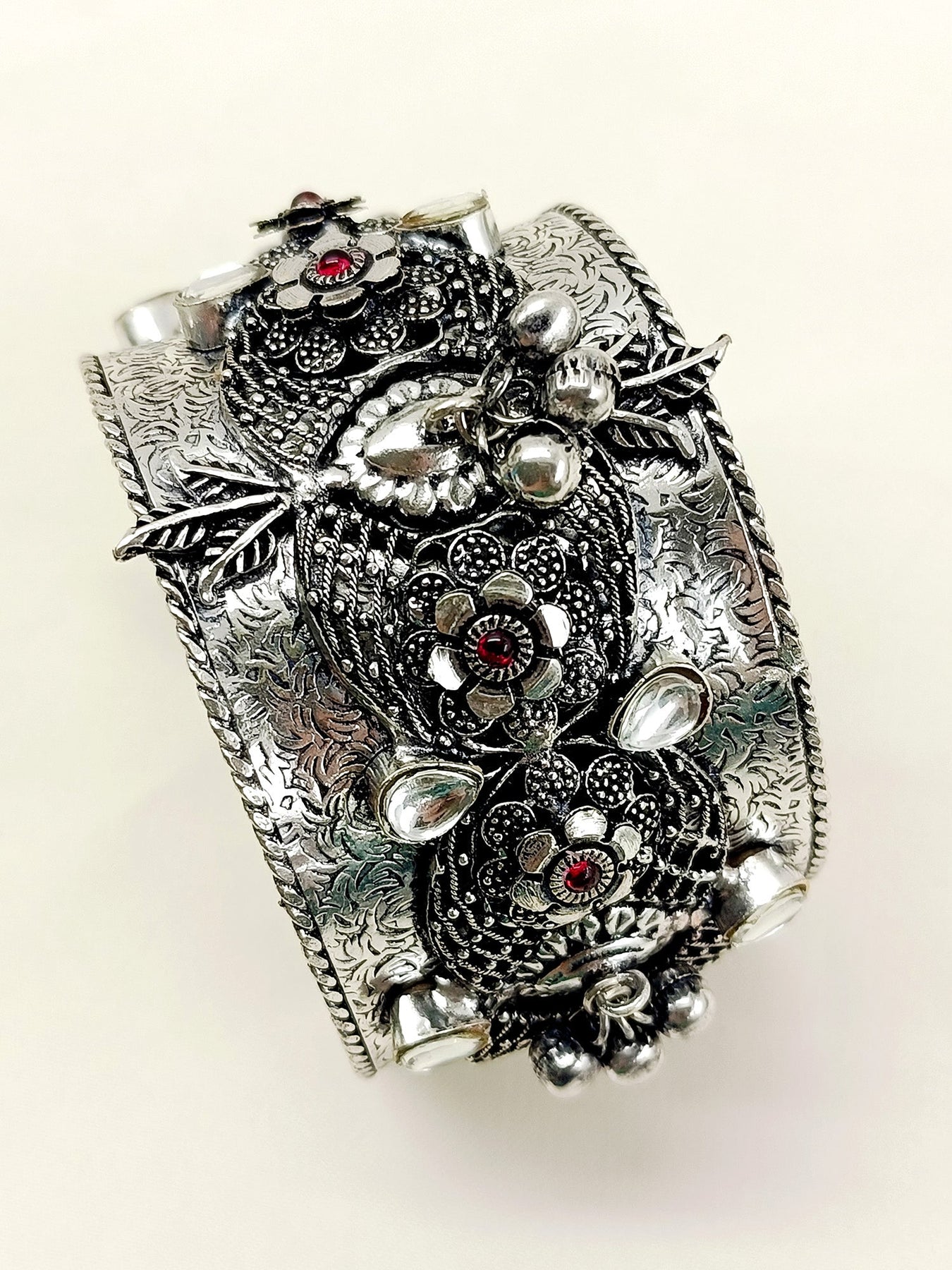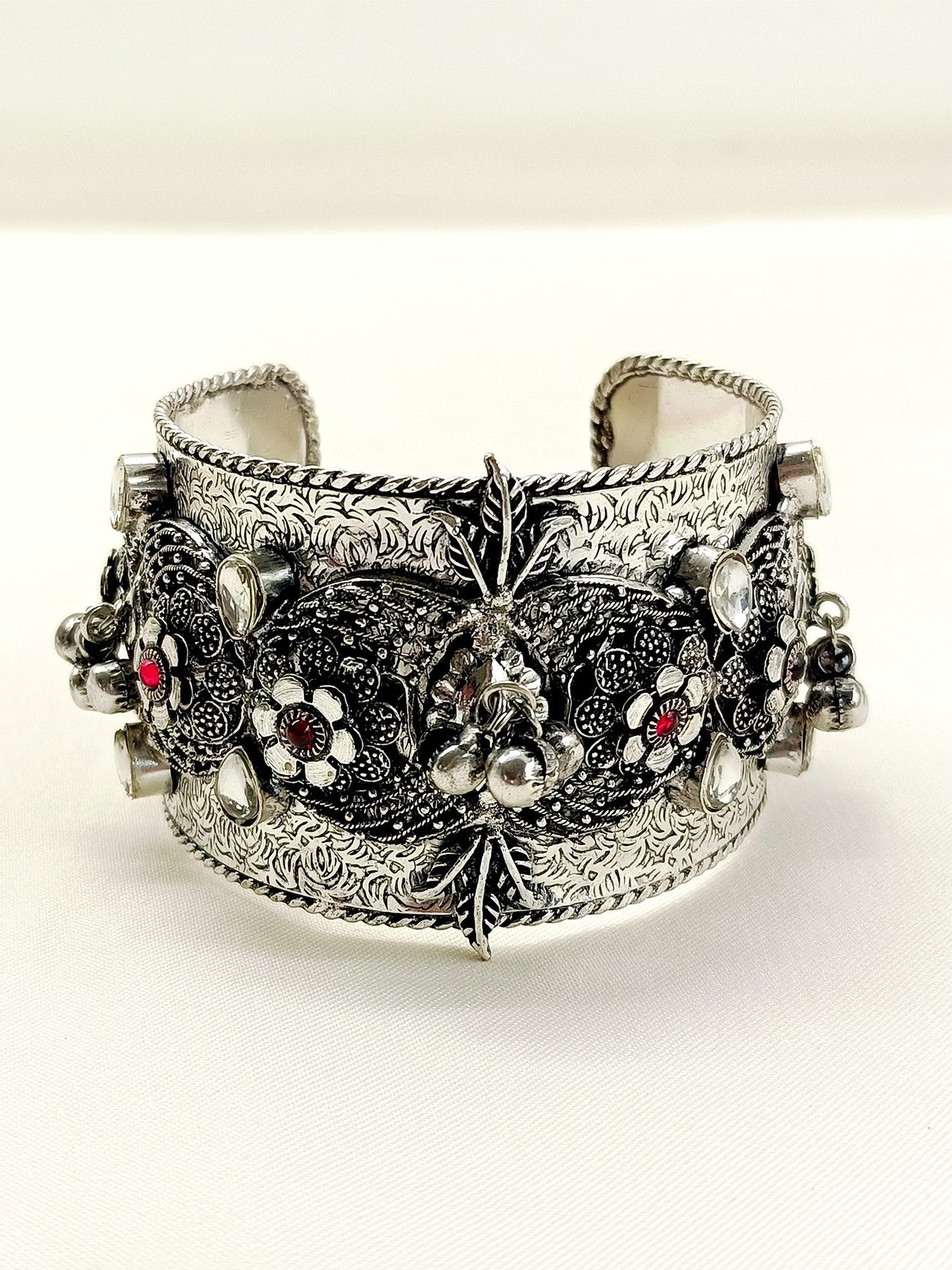 This R&W Oxidized Bracelet Features A Durable Brass Base With Oxidized Silver Plating, Offering A Vintage-inspired Look That Resists Tarnish. Adorned With Delicate Ghungroo Charms And Semi-precious Stones, It Combines Traditional Craftsmanship With Elegant Design. Perfect For Adding A Subtle Yet Distinctive Touch To Any Outfit, This Bracelet Balances Style And Cultural Heritage With Lasting Quality.