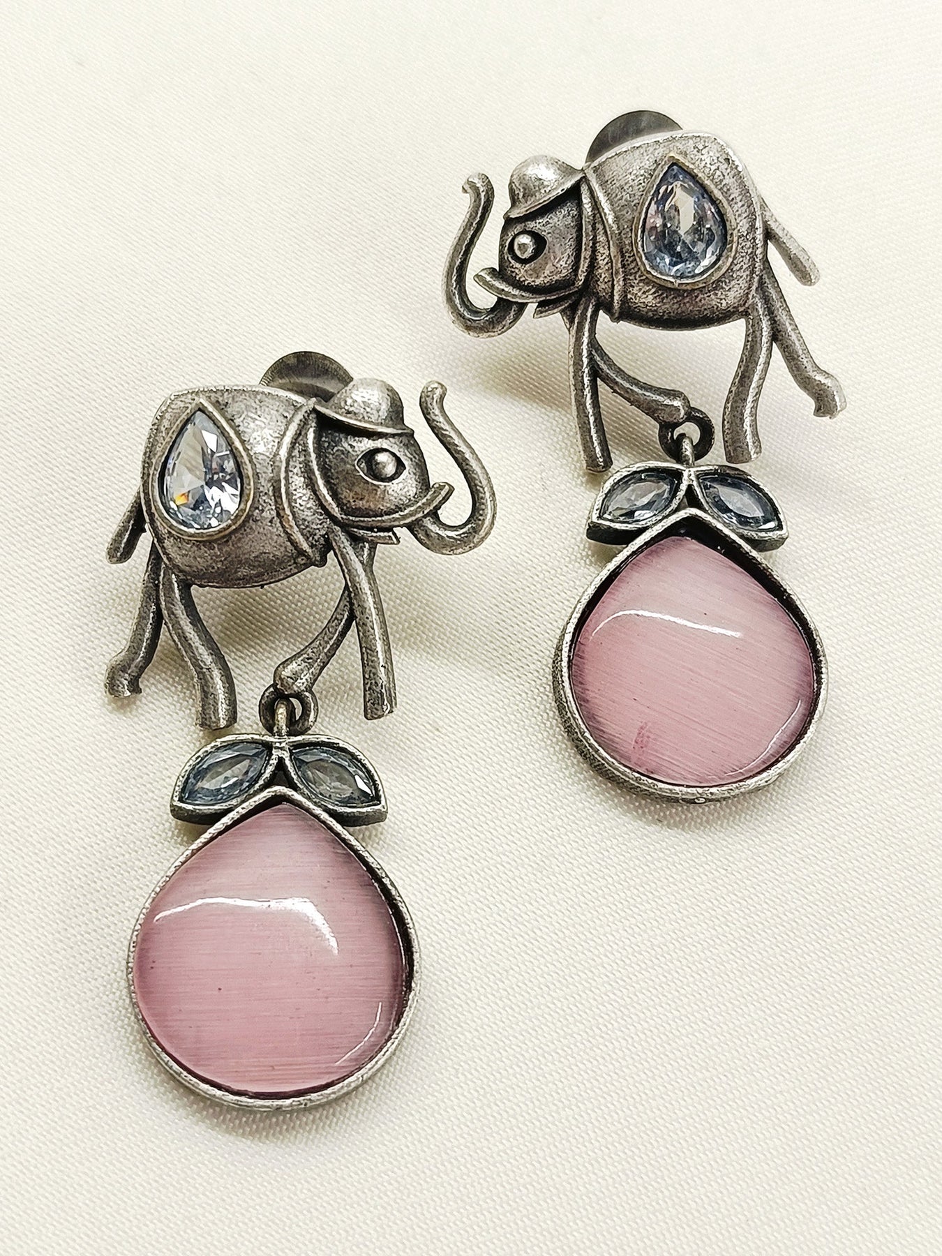 These Baby Pink Oxidized Earrings Feature An Elegant Elephant Design Crafted With Oxidized Silver Plating, Offering A Vintage-inspired Look. Accented With Semi-precious Stones, They Combine Traditional Artistry With Subtle Color, Making Them A Refined Choice For Those Who Appreciate Detailed Craftsmanship And Unique Style. Perfect For Adding A Distinctive Touch To Any Outfit.
