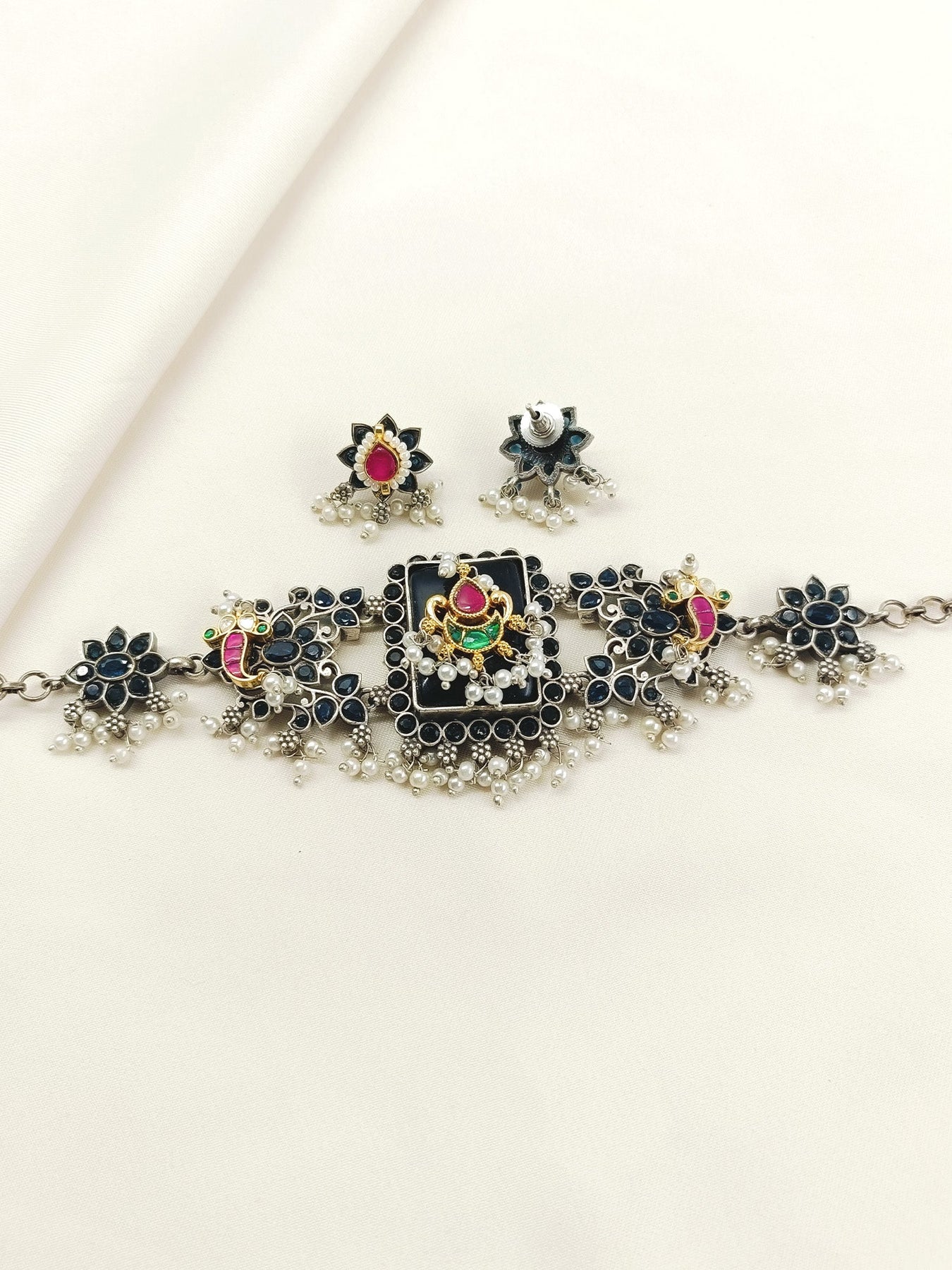 This Exquisite Blue Oxidized Choker Set Combines Traditional Craftsmanship With Contemporary Elegance. Crafted From Oxidized Silver-plated Brass, The Piece Features A Sophisticated Dark Finish That Enhances Its Vintage Appeal. Adorned With Semi-precious Stones And Intricate Kundan Work, It Showcases Meticulous Detailing. Delicate Pearl Accents Dangle Gracefully, Adding Movement And Refinement. Perfect For Festive Occasions Or Elevated Everyday Wear, This Choker Set Delivers Authentic Artisanal Quality With Timeless Design Sensibility.