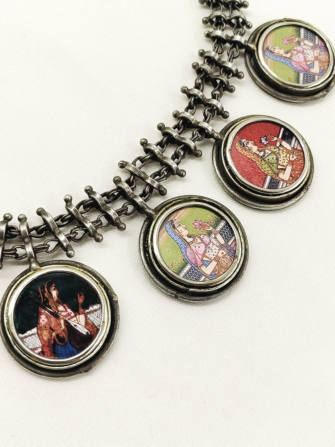 This Multi-colour Oxidized Neckpiece Is Crafted From Silver-plated Brass Metal With An Oxidized Finish, Offering A Vintage Appeal. Featuring Traditional Painting Techniques, It Combines Intricate Artistry With Durable Materials, Making It A Distinctive Accessory That Enhances Ethnic And Contemporary Outfits Alike.