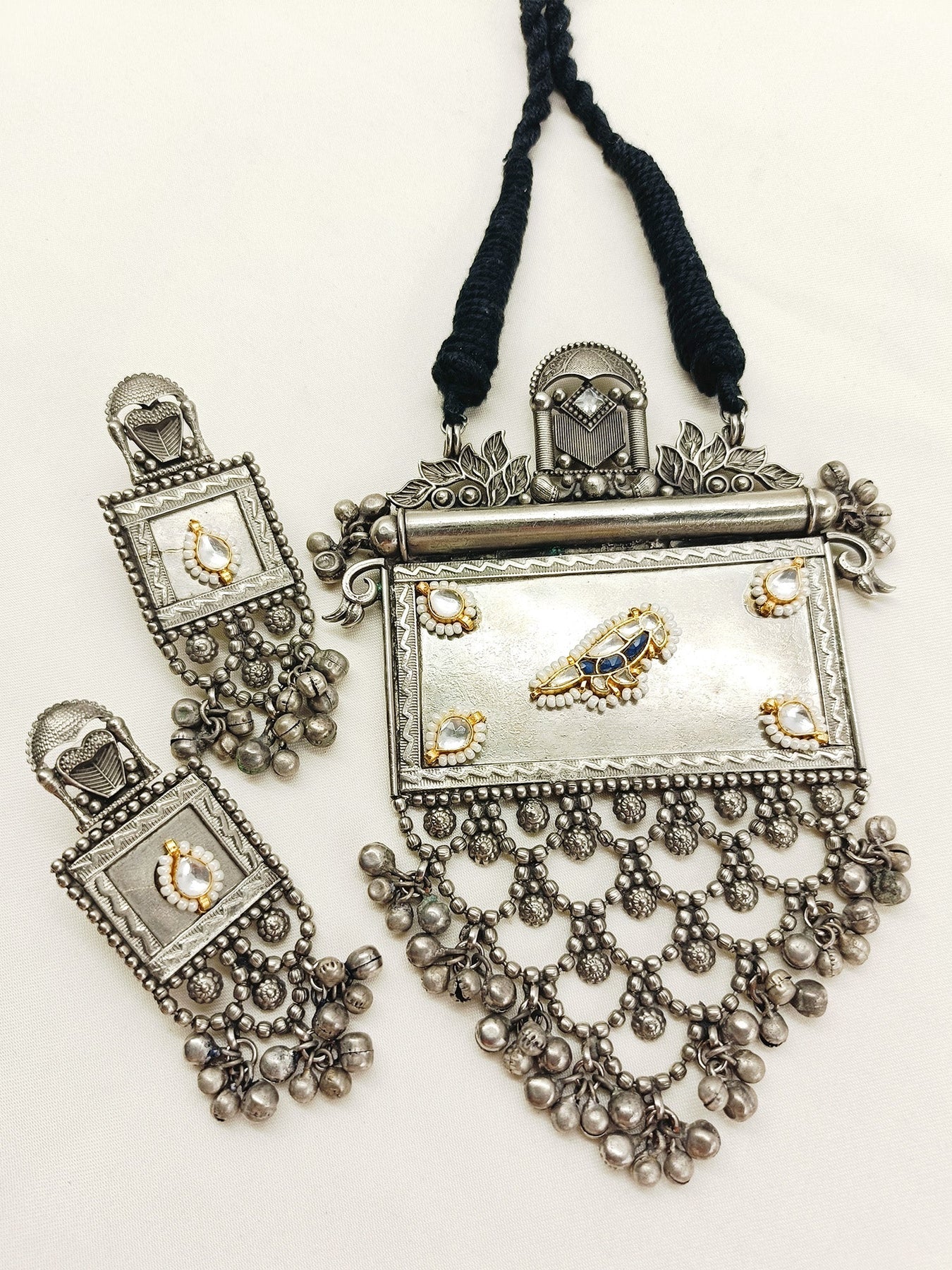 Elevate Your Style With This Blue Oxidized Pendant Set, Crafted From Oxidized Silver-plated Brass And Adorned With Traditional Kundan Work. The Oxidized Finish Offers A Vintage Charm While Ensuring Durability, Making It A Perfect Accessory For Both Casual And Festive Occasions. Its Intricate Design Highlights Expert Craftsmanship, Adding A Sophisticated Touch To Your Jewelry Collection.