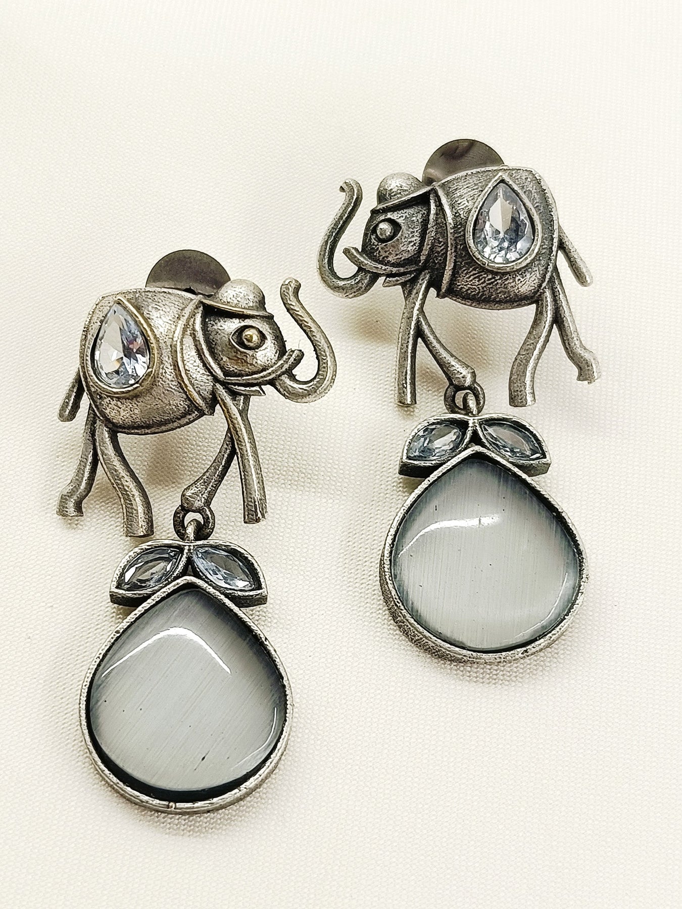 These Grey Oxidized Earrings Feature An Elegant Elephant Design Crafted With Oxidized Silver Plating, Offering A Vintage-inspired Look. Accented With Semi-precious Stones, They Combine Traditional Artistry With Subtle Color, Making Them A Refined Choice For Those Who Appreciate Detailed Craftsmanship And Unique Style. Perfect For Adding A Distinctive Touch To Any Outfit.