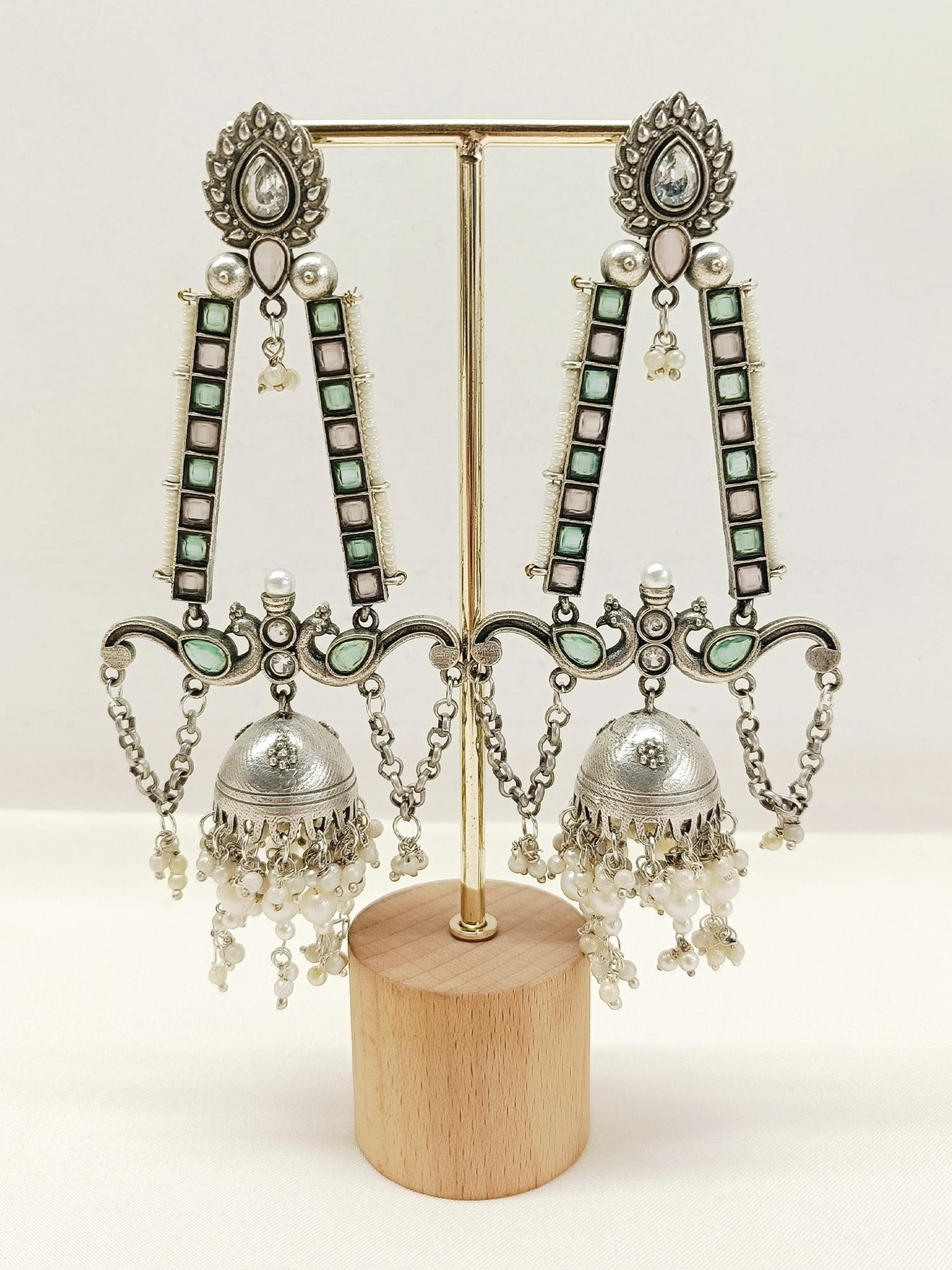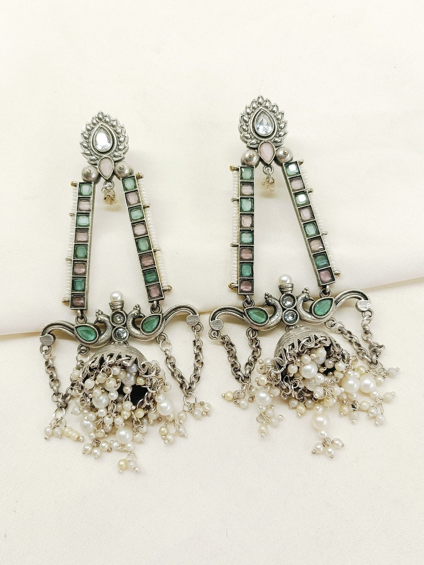 Elevate Your Traditional Collection With The Mint Green Oxidized Jhumki, Crafted From Oxidized Silver-plated Brass For Durability And A Vintage Appeal. Featuring Delicate Pearls And Beads Hanging Gracefully, This Piece Combines Classic Charm With Intricate Detailing, Perfect For Adding A Refined Touch To Ethnic And Contemporary Outfits Alike.