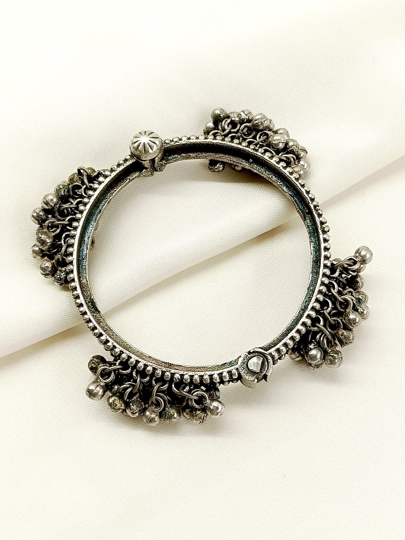 This Pacheli Oxidized Bangle Features An Elegant Oxidized Silver Plating, Accented With Ghunghroo For A Traditional Touch. Crafted With Expertise And Precision, This Bangle Adds A Stylish Flair To Any Outfit. Elevate Your Jewelry Collection With This Timeless Piece.