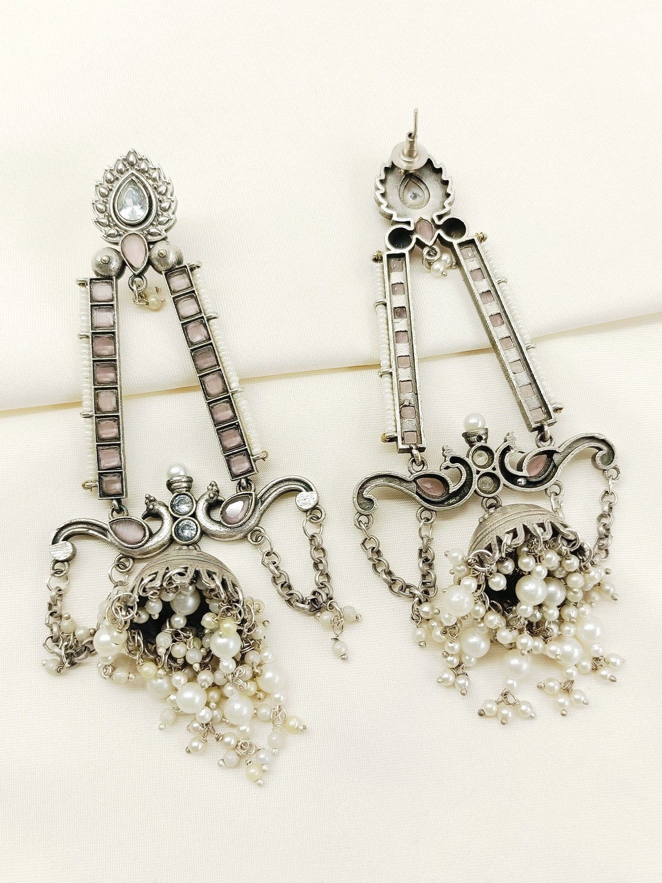 Elevate Your Traditional Collection With The Pink Oxidized Jhumki, Crafted From Oxidized Silver-plated Brass For Durability And A Vintage Appeal. Featuring Delicate Pearls And Beads Hanging Gracefully, This Piece Combines Classic Charm With Intricate Detailing, Perfect For Adding A Refined Touch To Ethnic And Contemporary Outfits Alike.