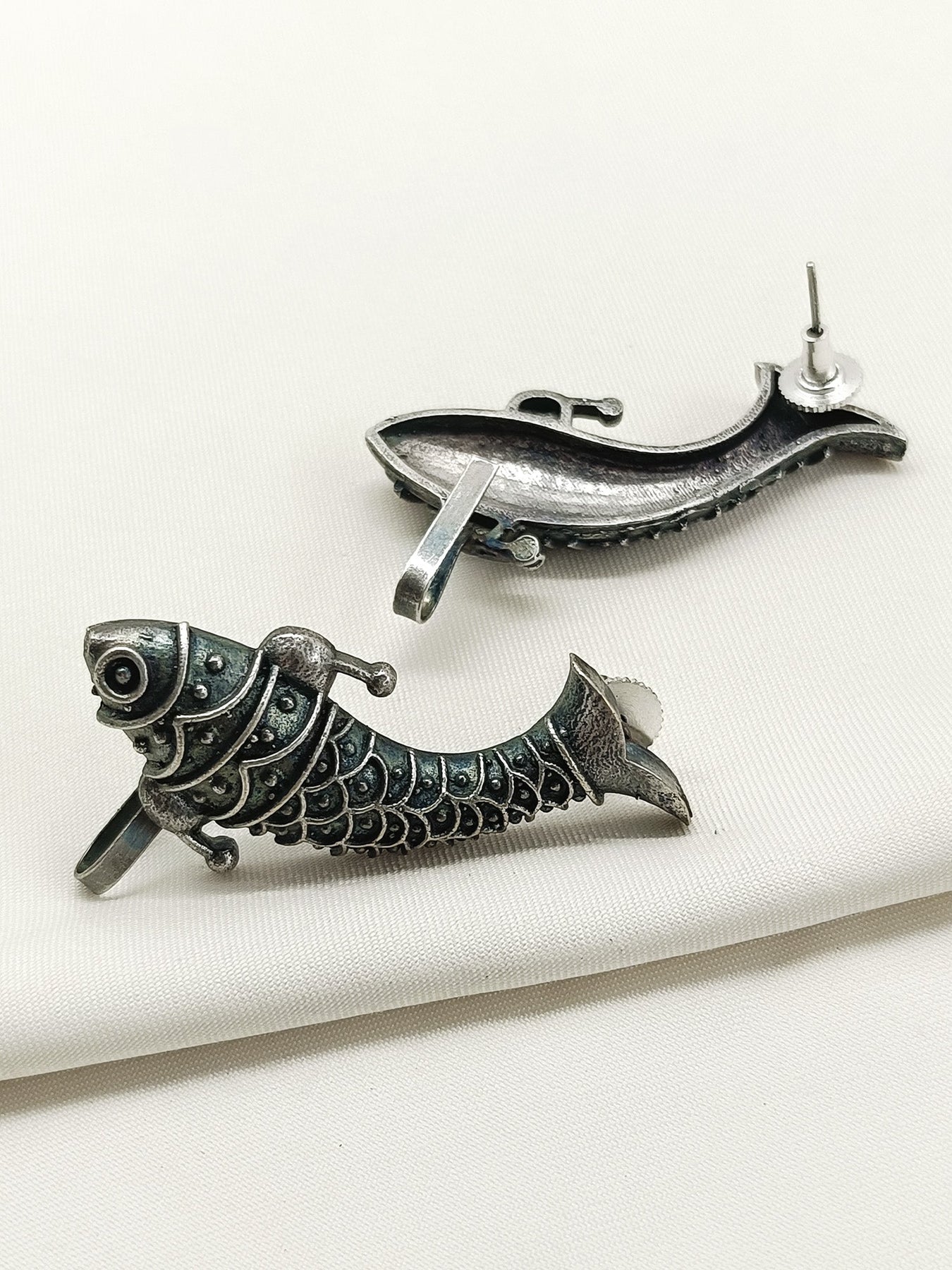 Crafted From Oxidized Silver-plated Brass, These Plain Earcuffs Feature A Distinctive Fish Design That Adds A Subtle Yet Artistic Touch To Your Look. The Oxidized Finish Enhances Durability While Providing A Vintage-inspired Aesthetic, Making Them A Versatile Accessory For Both Casual And Formal Occasions. Their Lightweight Construction Ensures Comfortable Wear Throughout The Day.