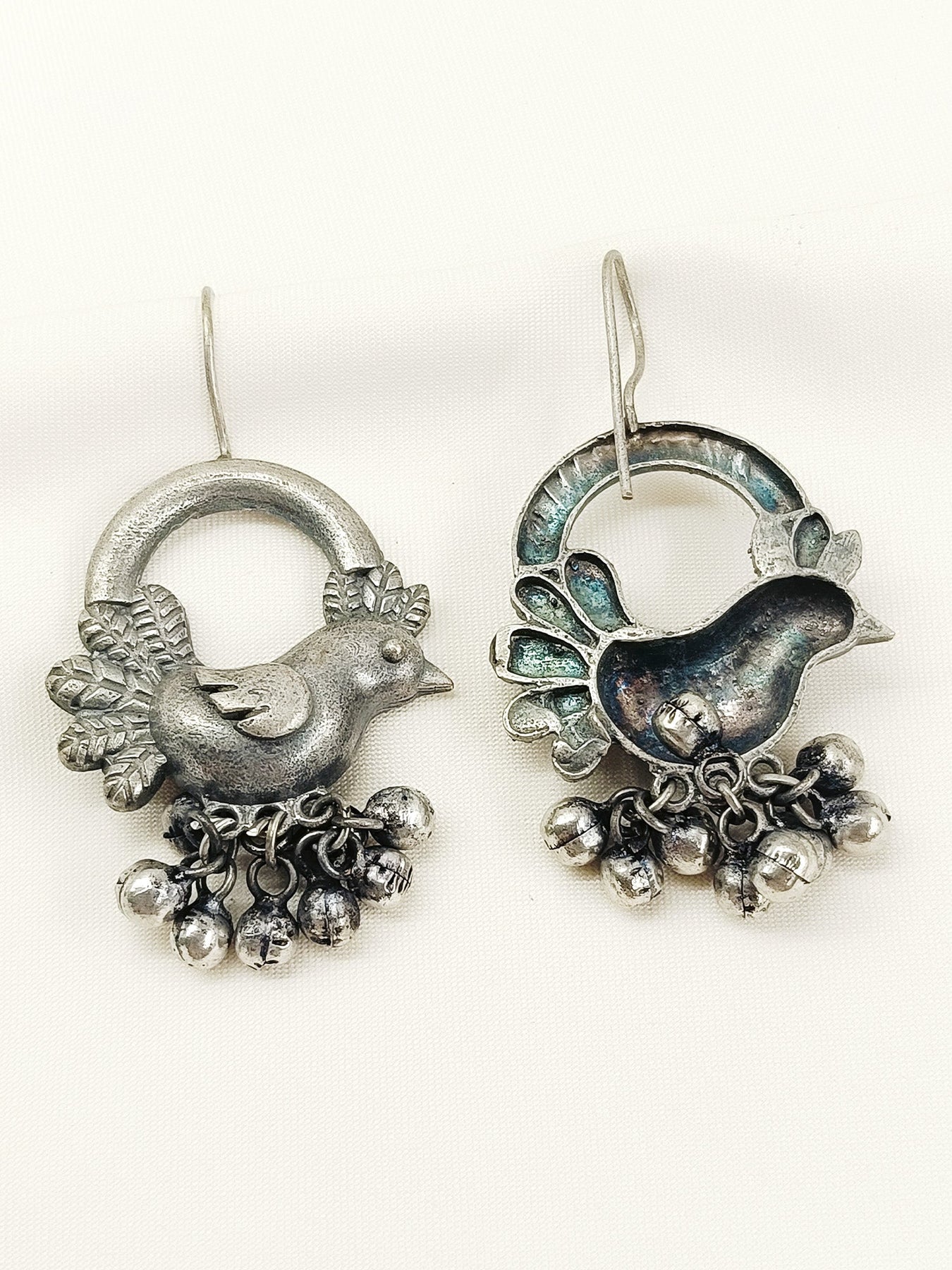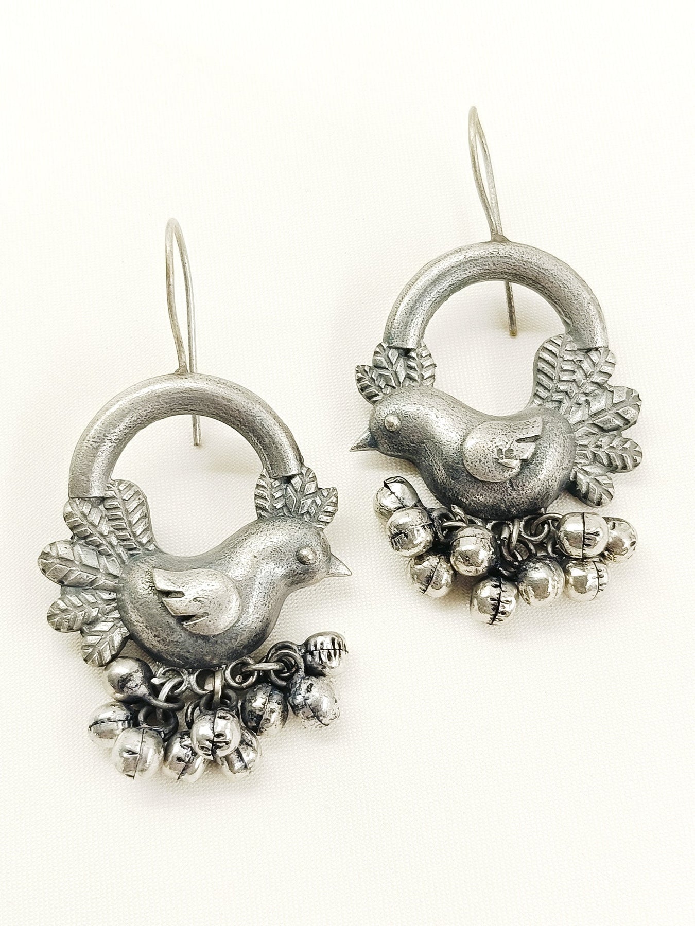 These Plain Oxidized Earrings Feature A Unique Bird-inspired Design Crafted From Oxidized Silver-plated Brass Metal. Accented With Traditional Ghunghroo Detailing, They Offer A Blend Of Rustic Charm And Cultural Elegance. Lightweight And Durable, These Earrings Are Perfect For Adding An Artisanal Touch To Your Everyday Or Festive Attire.