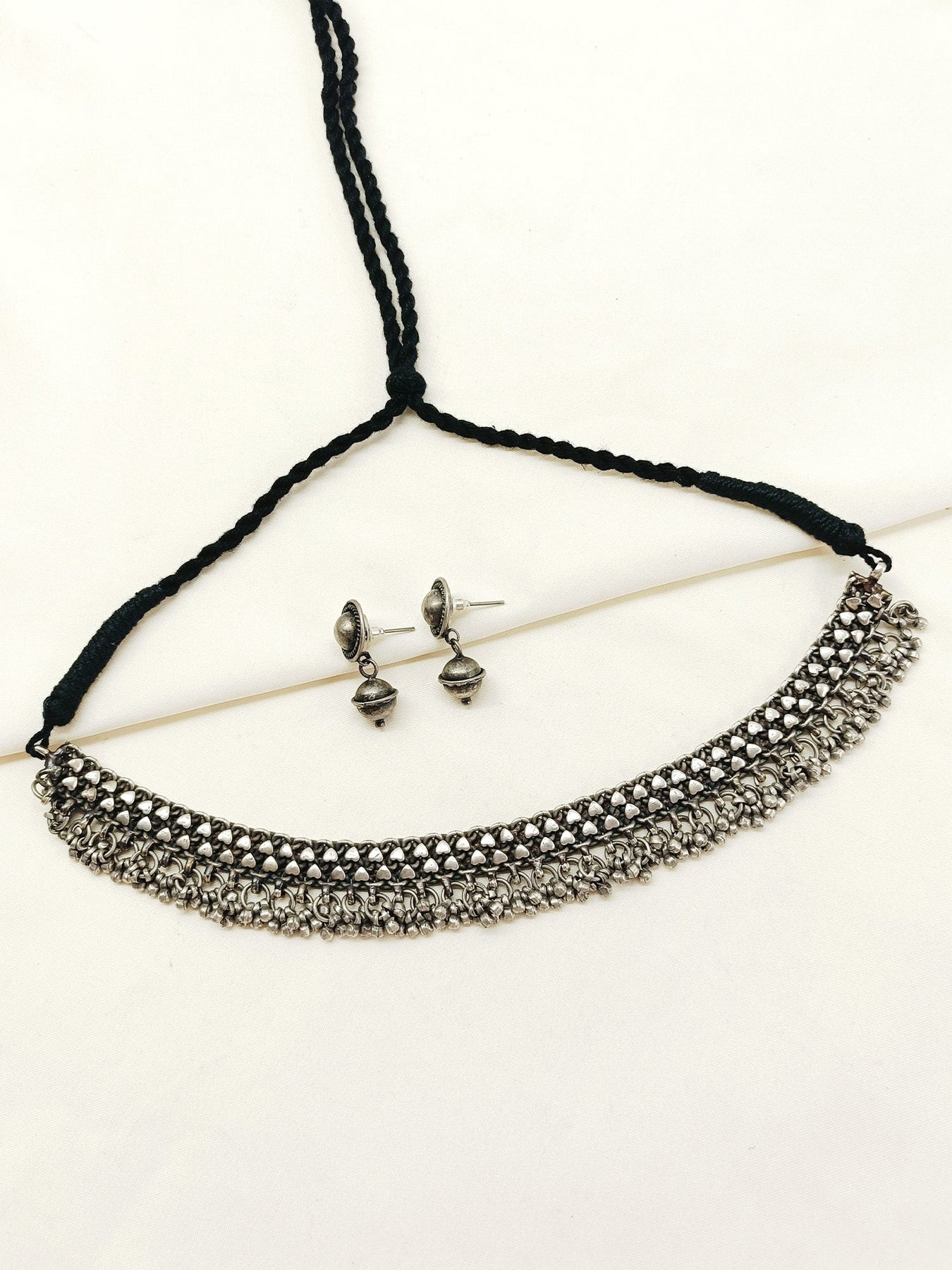 This Plain Oxidized Necklace Set Features Expertly Crafted Oxidized Silver-plated Brass, Offering A Timeless Antique Look. The Set Is Complemented By A Resham Dori, Adding A Traditional Touch And Adjustable Comfort. Ideal For Enhancing Ethnic And Contemporary Outfits, It Combines Durability With Classic Style For Versatile Wear.
