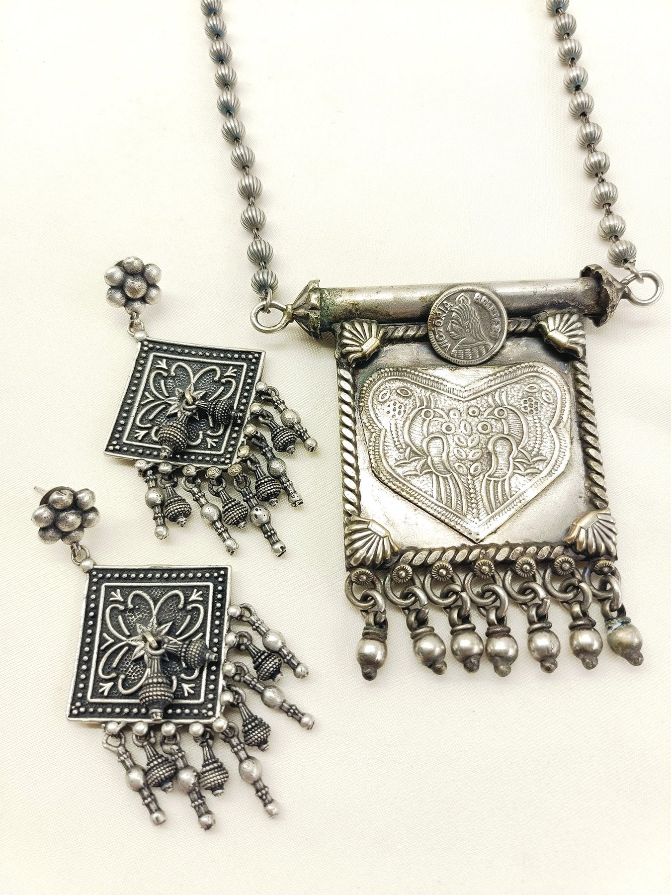 This Plain Oxidized Pendant Set Features A Timeless Design Crafted From Oxidized Silver-plated Brass, Offering Durability With A Vintage-inspired Finish. Its Oxidized Treatment Enhances The Metal’s Texture And Depth, Making It An Ideal Accessory For Adding Subtle Elegance To Both Casual And Formal Outfits. Perfect For Those Seeking A Classic Yet Distinctive Jewelry Piece.