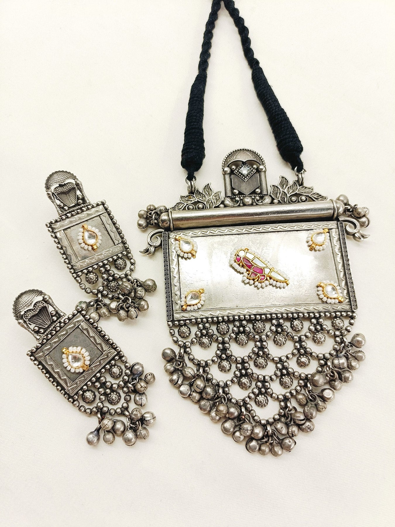 Elevate Your Style With This Red Oxidized Pendant Set, Crafted From Oxidized Silver-plated Brass And Adorned With Traditional Kundan Work. The Oxidized Finish Offers A Vintage Charm While Ensuring Durability, Making It A Perfect Accessory For Both Casual And Festive Occasions. Its Intricate Design Highlights Expert Craftsmanship, Adding A Sophisticated Touch To Your Jewelry Collection.
