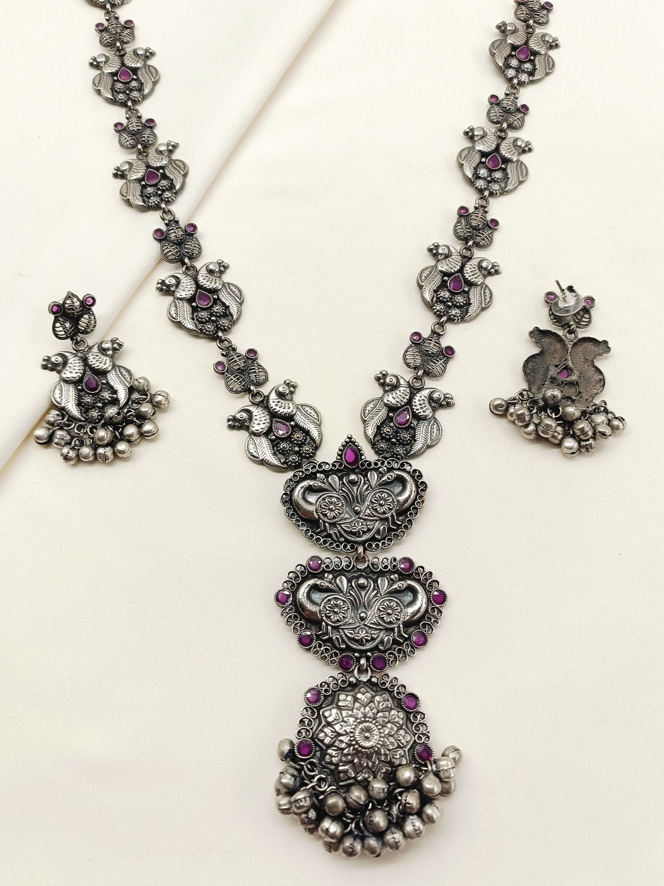 This Ruby Oxidized Necklace Set Is Crafted From Oxidized Silver-plated Brass, Offering A Durable Yet Elegant Foundation. Featuring Semi-precious Stones And Traditional Ghunghroo Accents, It Blends Classic Charm With Intricate Detailing. Perfect For Enhancing Ethnic And Contemporary Outfits, This Set Delivers A Sophisticated Statement With Expert Craftsmanship.
