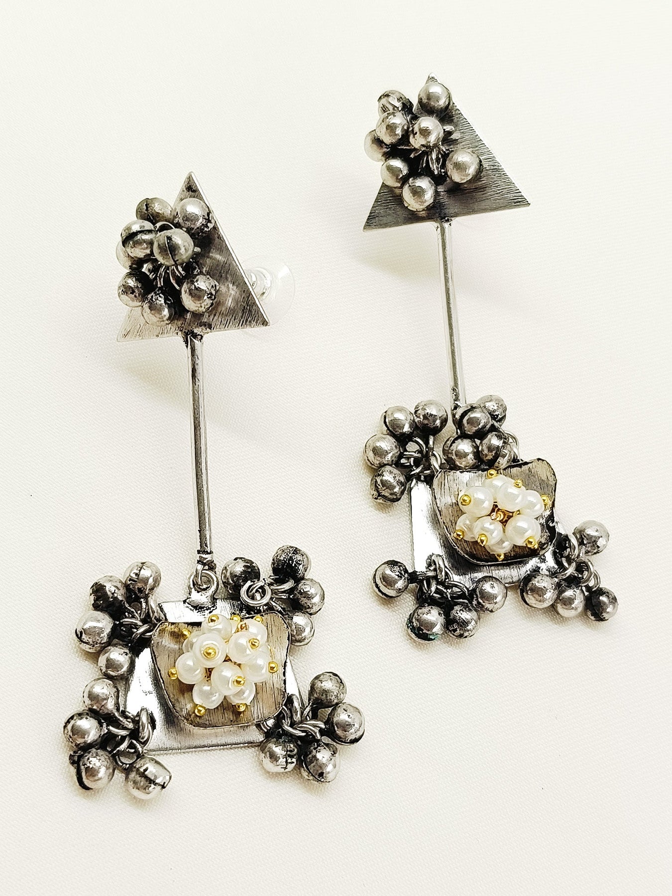 These White Pearl Oxidized Earrings Feature A Sophisticated Blend Of Oxidized Silver-plated Brass, Delicate Pearls, And Traditional Ghunghroo Accents. Expertly Crafted, They Offer A Timeless Appeal That Complements Both Contemporary And Ethnic Styles, Adding A Subtle Yet Striking Touch To Your Ensemble. Durable And Lightweight, These Earrings Provide Comfort Without Compromising On Elegance.