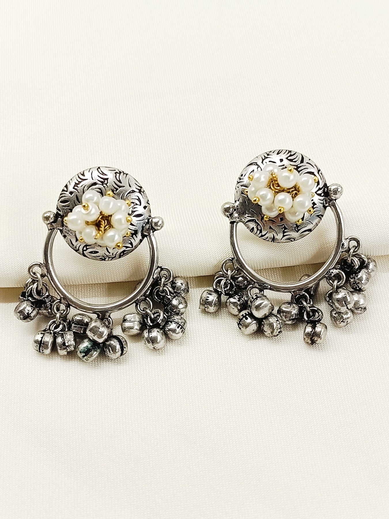 These White Oxidized Earrings Feature A Sophisticated Blend Of Oxidized Silver-plated Brass, Delicate Pearls, And Traditional Ghunghroo Accents. Expertly Crafted, They Offer A Timeless Appeal That Complements Both Contemporary And Ethnic Styles, Adding A Subtle Yet Striking Touch To Your Ensemble. Durable And Lightweight, These Earrings Provide Comfort Without Compromising On Elegance.