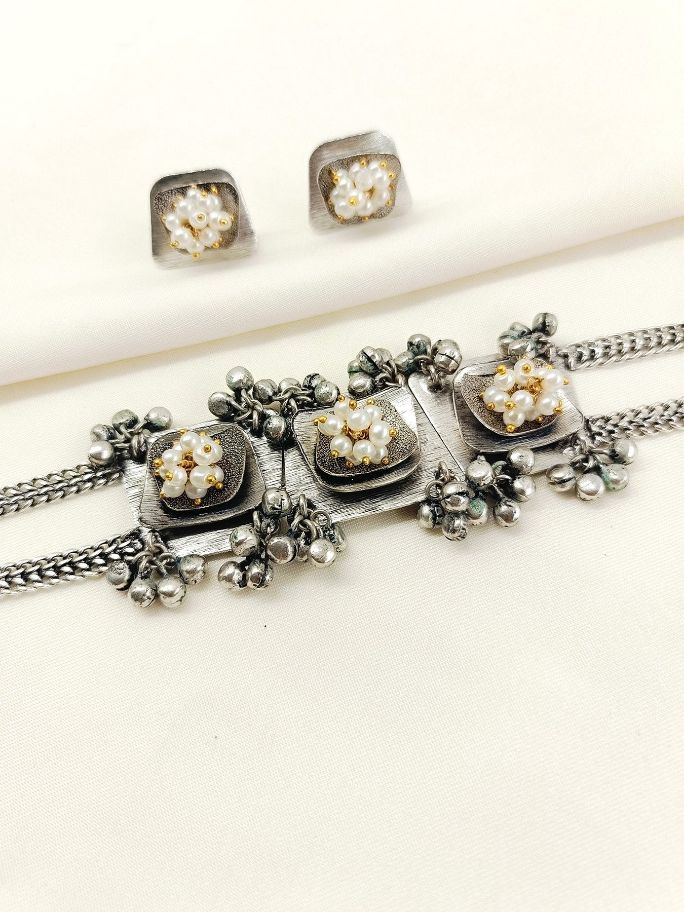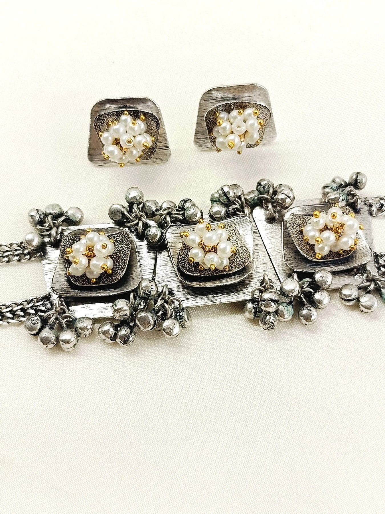 This White Pearl Oxidized Choker Set Features An Oxidized Silver-plated Brass Base, Offering Durability With A Vintage Appeal. Adorned With Semi-precious Stones And Delicate Pearl Hangings, It Combines Elegance With Artisanal Craftsmanship. Ideal For Adding A Sophisticated Touch To Traditional And Contemporary Outfits Alike.