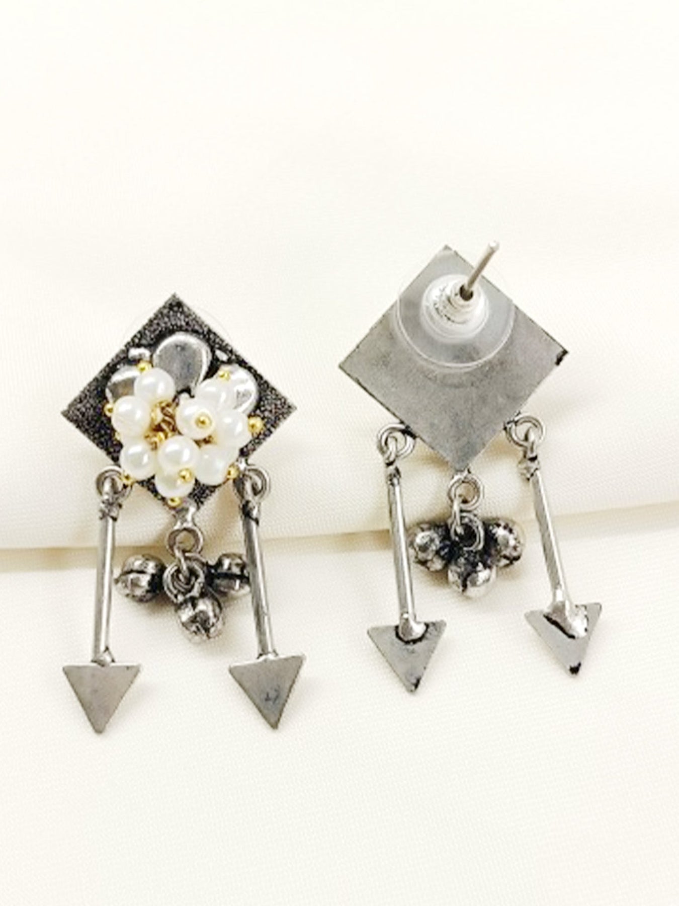 These White Pearl Oxidized Earrings Feature A Sophisticated Blend Of Oxidized Silver-plated Brass And Lustrous Pearls, Accented With Delicate Ghunghroo Hangings. Expertly Crafted, They Offer A Timeless Appeal That Complements Both Traditional And Contemporary Styles, Adding An Elegant Touch To Any Ensemble.