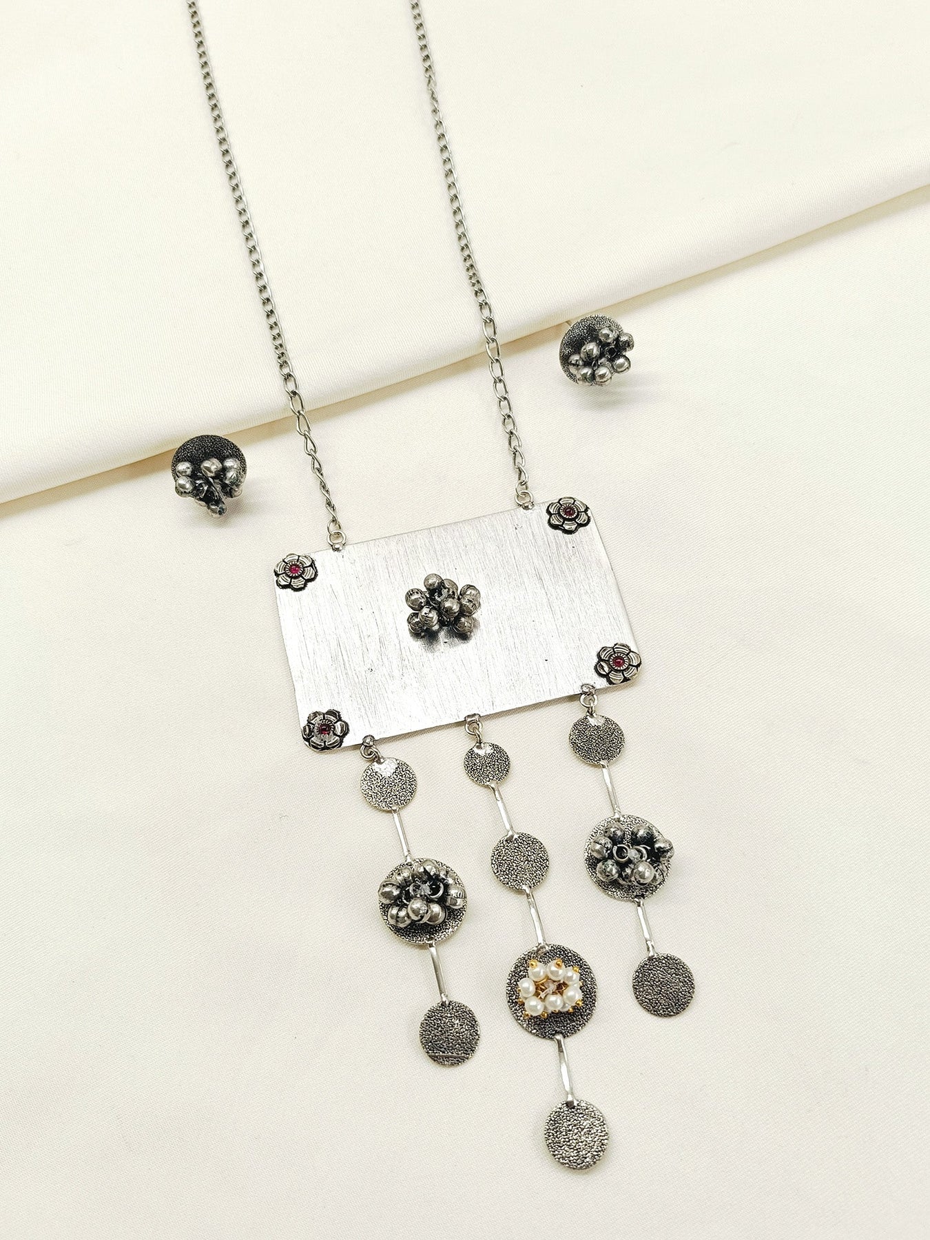 This White Pearl Oxidized Pendant Set Features An Elegant Combination Of Oxidized Silver-plated Brass And Lustrous White Pearls, Accented With Semi-precious Stones For A Refined Touch. The Intricate Design Is Enhanced By Traditional Ghunghroo Detailing, Adding Subtle Movement And Charm. Perfect For Those Seeking A Blend Of Classic Craftsmanship And Contemporary Style, This Set Offers Durability And Timeless Appeal For Any Occasion.