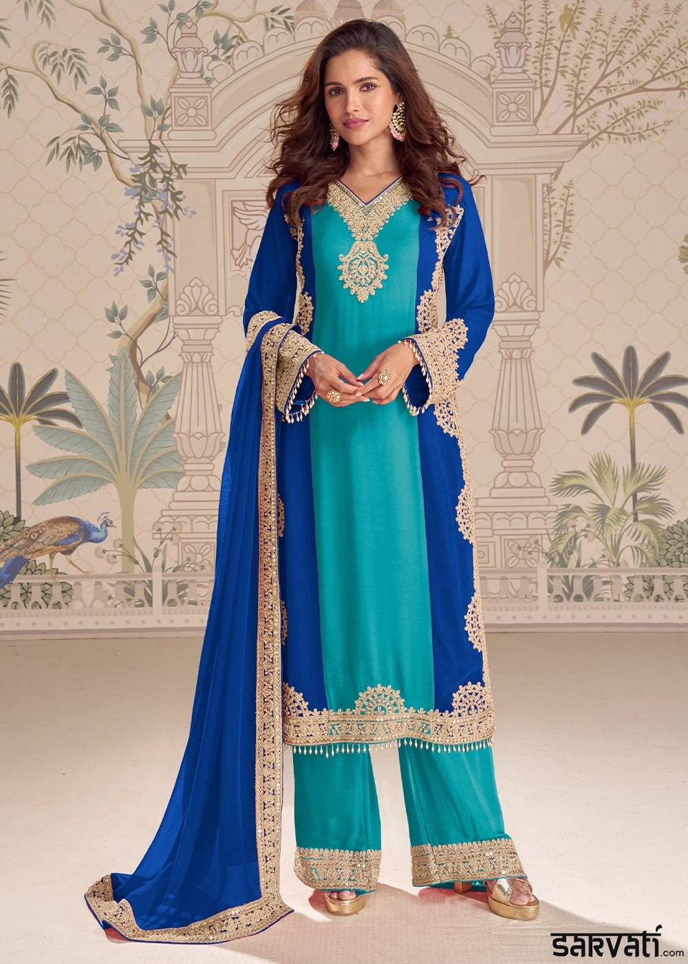 Teal Blue Chinon Silk Palazzo Suit with Delicate Embroidery work